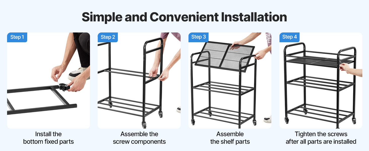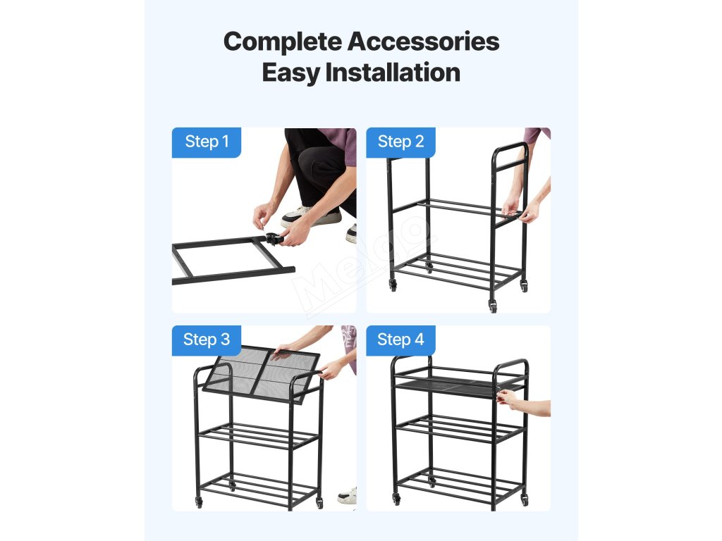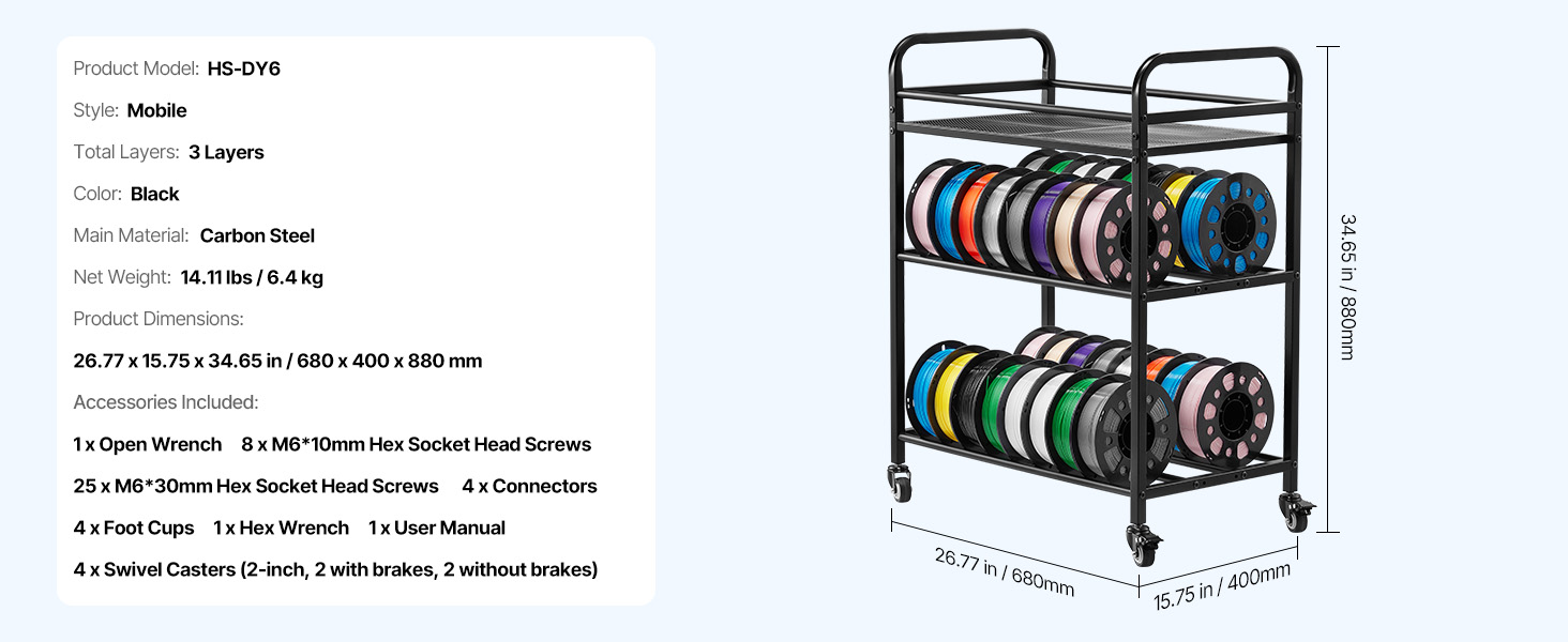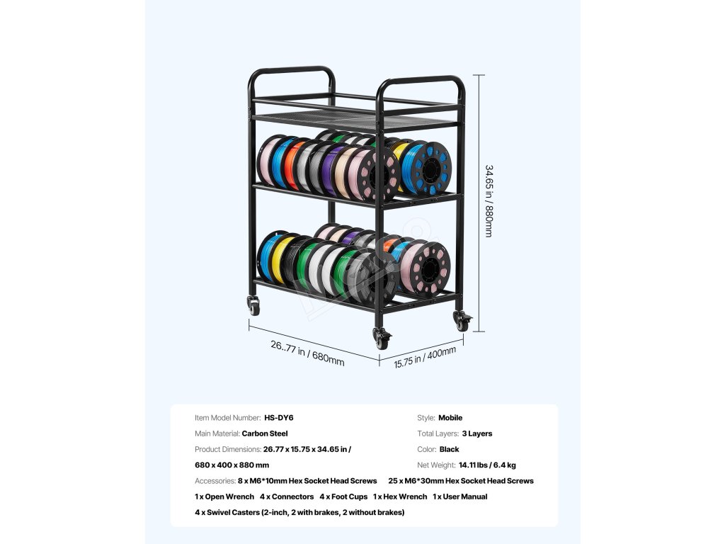 Tento regál na filamenty je vybavený 360° otočnými kolieskami s brzdovým systémom, ktoré umožňujú jednoduchý pohyb a bezpečné umiestnenie. Jeho robustný rám z uhlíkovej ocele a doska MDF unesú až 110 libier / 50 kg, vďaka čomu je prístup k vašim predmetom bezproblémový a pohodlný!