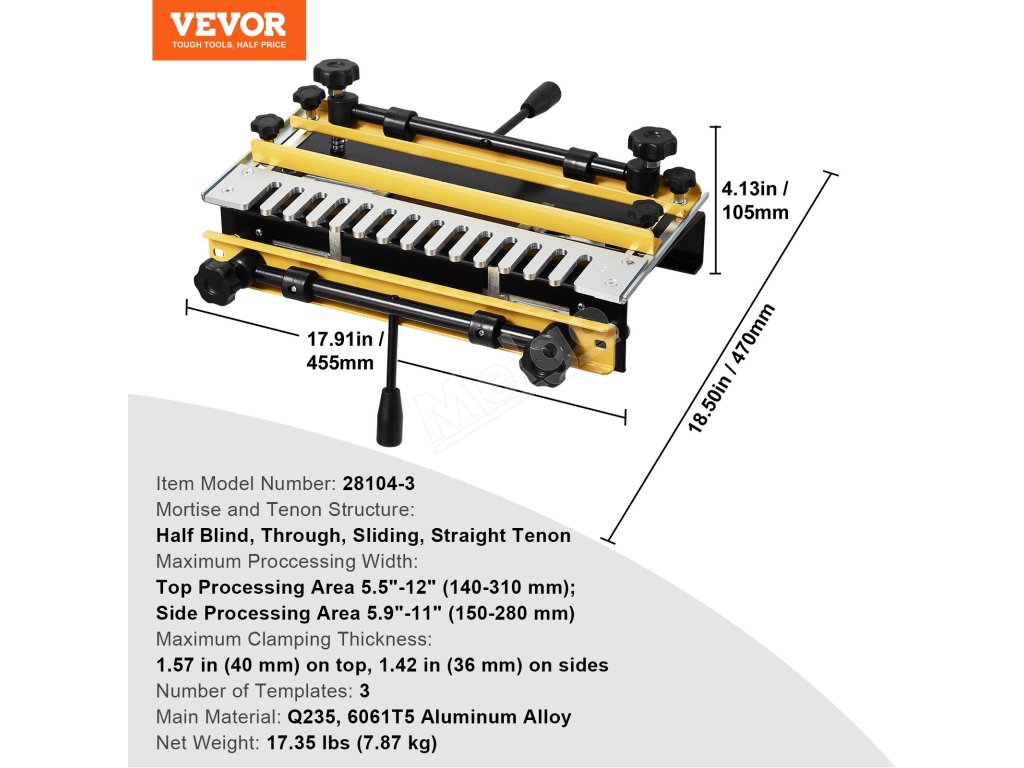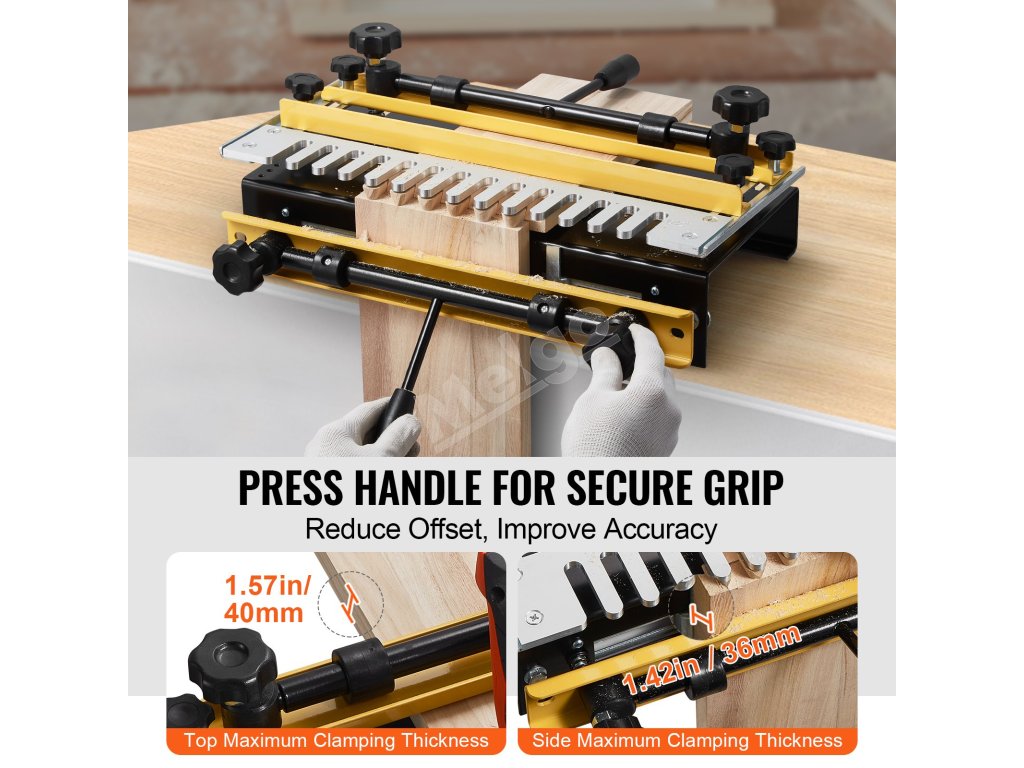 Tento prípravok na holubičie chvosty sa dodáva s 3 šablónami a 4 frézovacími bitmi, vďaka čomu je vhodný na malé aj veľké nábytkárske projekty. Jeho konštrukcia s aretačnou pákou zaisťuje bezpečné uchopenie a umožňuje vždy presné a stabilné rezy. Šablóna je vyrobená z liateho hliníka a sľubuje dlhodobú životnosť.