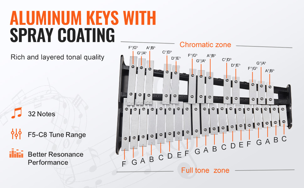 Profesionálny zvonkoherný xylofón s 32 notami obsahuje: 32 notový xylofón x1, taška na prenášanie x1, nastaviteľný stojan x1, notový stojan x1, cvičná podložka x1, paličky x4, paličky x2, návod na použitie x1, svorky x2 a 8-palcová cvičná podložka. Široký rozsah tónov od F5 do C8 zaručuje pohodlie!