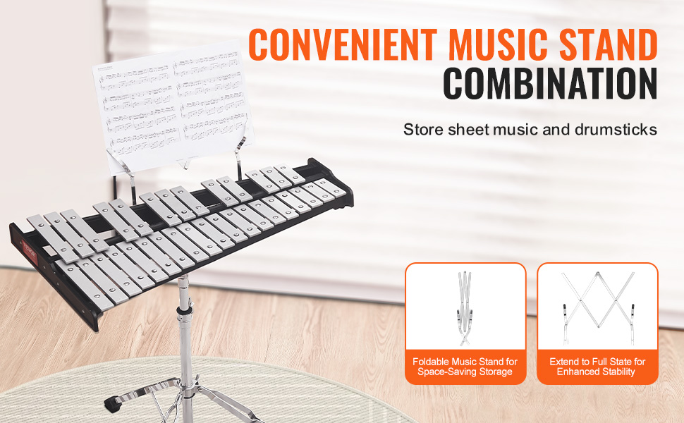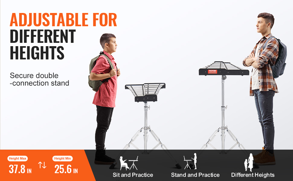 Stojan vyrobený z vysokopevnostného galvanizovaného materiálu a vybavený robustnou konštrukciou s dvoma spojovacími nohami zaisťuje bezpečné upevnenie xylofónu. Vďaka nastaviteľnej výške v rozsahu 25,6 - 37,8 palca a nastaviteľným uhlom sa prispôsobí osobám rôzneho veku a výšky.