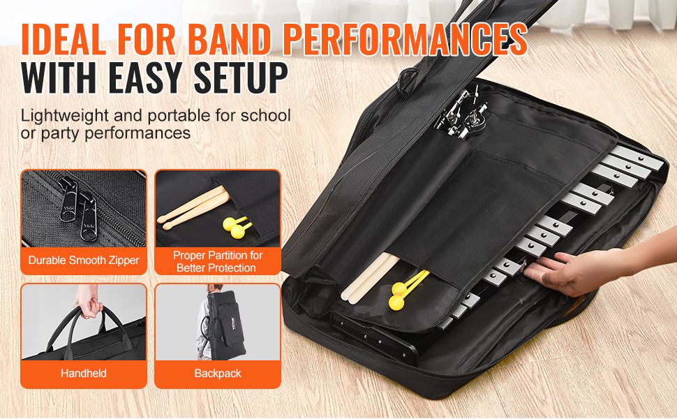 Je vybavený dvojúčelovou taškou na prenášanie, takže ho možno prenášať v ruke alebo na chrbte. Zvonkohra je vyrobená zo zhrubnutej tkaniny 1200D Oxford, je pevná, odolná, nepremokavá, priedušná, poskytuje lepšiu ochranu pre váš milovaný nástroj, vhodná na prenášanie medzi domovom, školou alebo vonku.