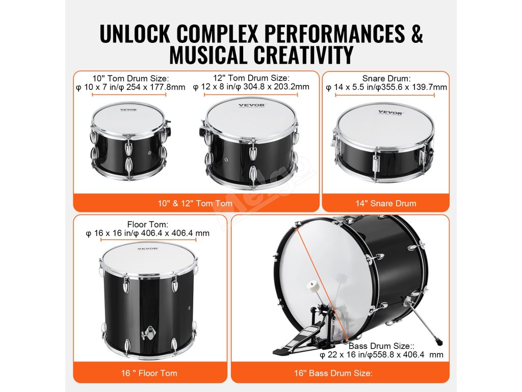 Naša bicia súprava pre dospelých obsahuje 10'' tom tom, 12'' tom tom, 14'' snare bubon, 22'' basový bubon a 16'' floor tom. Vďaka topoľovému bubnovému plášťu a PET bubnovej hlave poskytujú naše bubny čistý a dynamický zvuk. Pozdvihnite svoju bubenícku cestu ešte dnes!