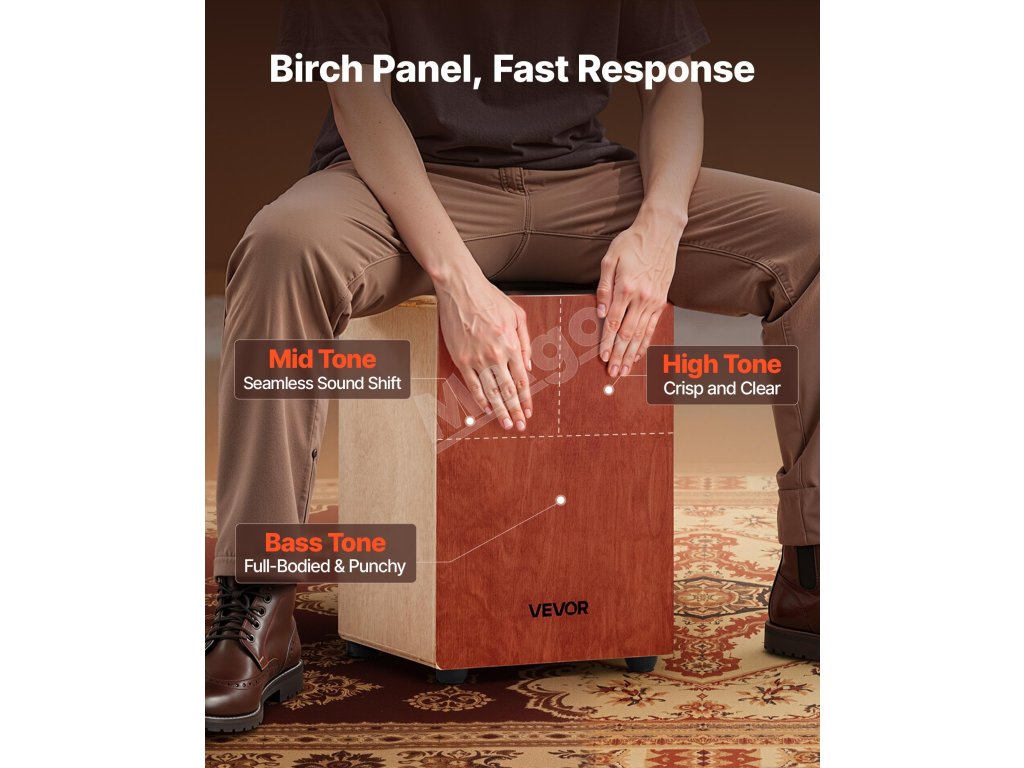 Rozdiel pocítite od prvého úderu, hladká vrchná doska z brezového dreva a nastaviteľné gitarové struny poskytujú prirodzený zvuk, ktorý sa hodí k popu, jazzu alebo folku. Tento boxový bubon je dostatočne jednoduchý pre začiatočníkov a dostatočne výrazný pre profesionálov.