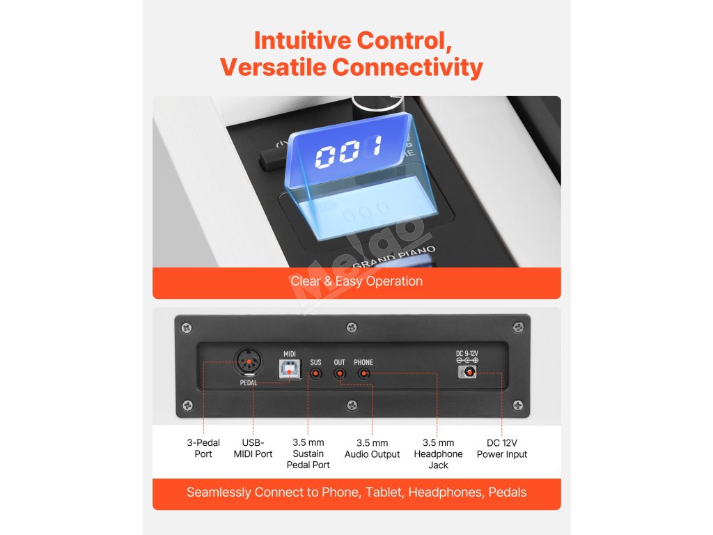 Klaviatúra s 88 plne váženými klávesmi podporuje bezdrôtový prenos a prenos MIDI a je vybavená viacerými portmi pre zariadenia. Môžete súčasne pripojiť sustain pedál, slúchadlá, mikrofón, počítač a ďalšie zariadenia.