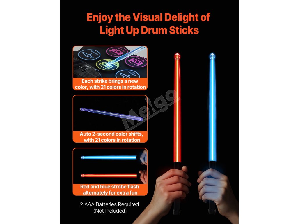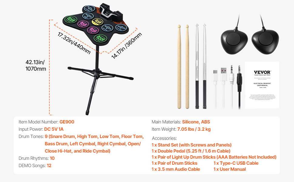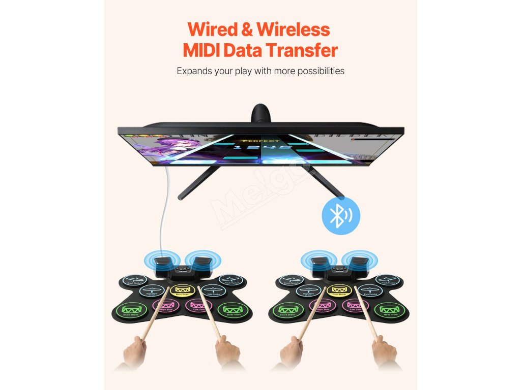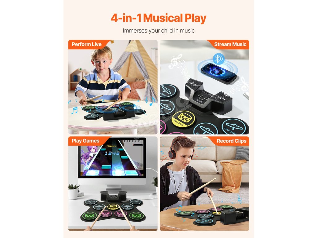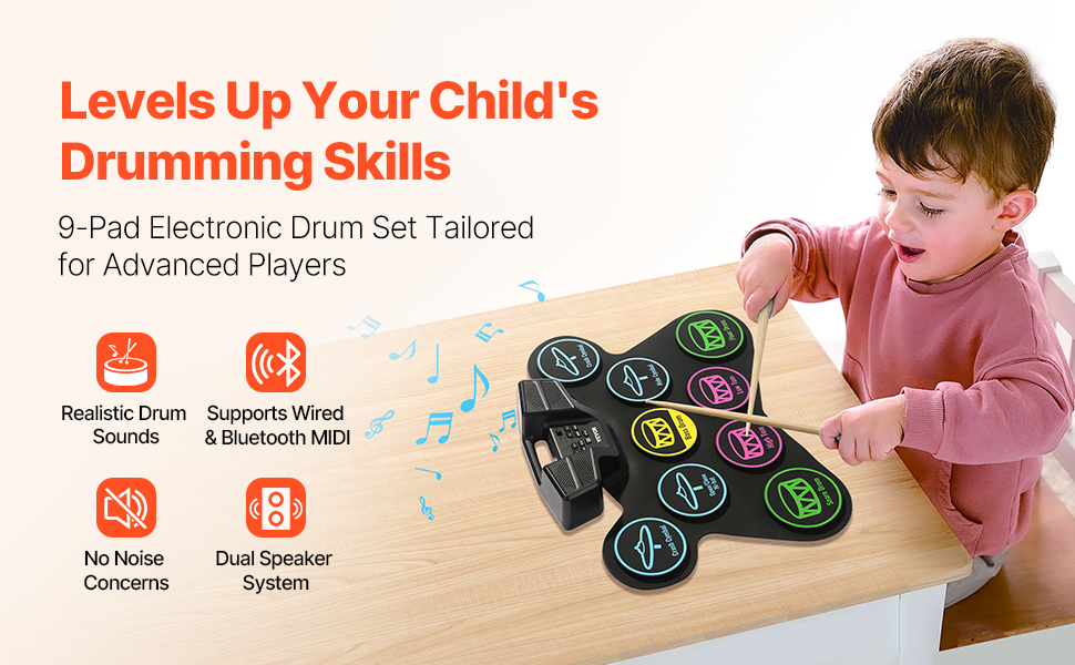Naša elektrická bicia súprava s 9 padmi a 2 pedálmi pomôže vášmu dieťaťu zvládnuť bubnovanie. Kombinuje živé hranie, prehrávanie hudby (Bluetooth a káblový prenos), hry DTX a nahrávanie. Vďaka konektoru na slúchadlá, udržateľnému silikónu a 2000 mAh dobíjacej batérii je vhodná na cvičenie kdekoľvek a kedykoľvek.