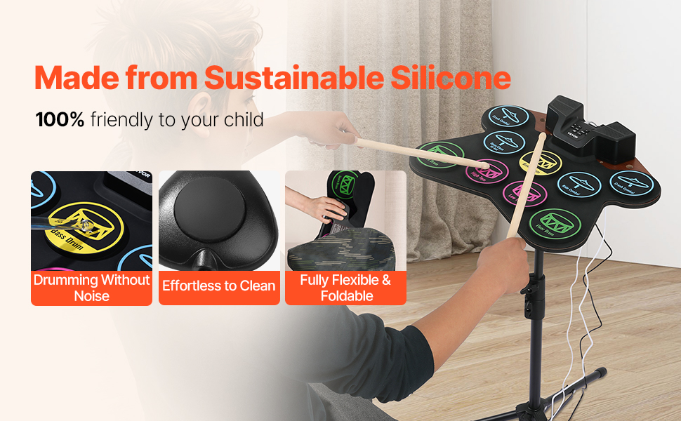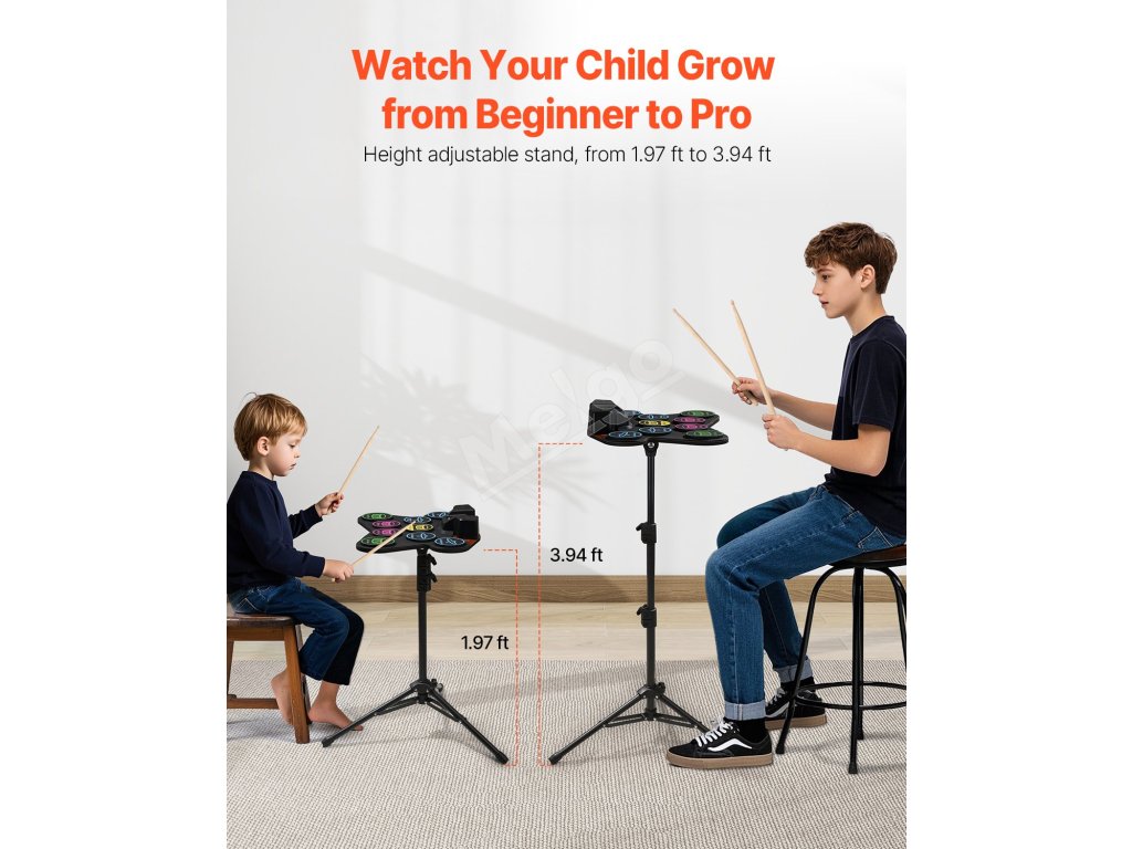 Nechajte svojho malého bubeníka zažiť vzrušenie z elektronického bubnovania! Naša digitálna bicia súprava je vybavená silikónovými podložkami na bubny, ktoré sú bezpečné, ľahko sa čistia a sú vhodné pre deti. Môže poskytnúť hodiny zábavy s minimálnou údržbou.