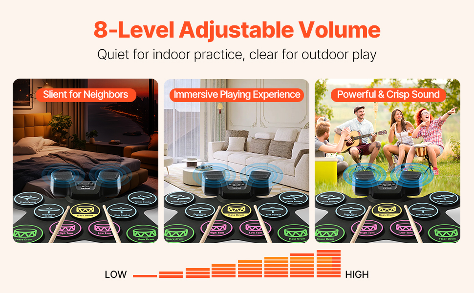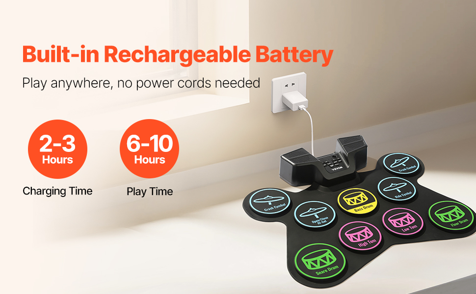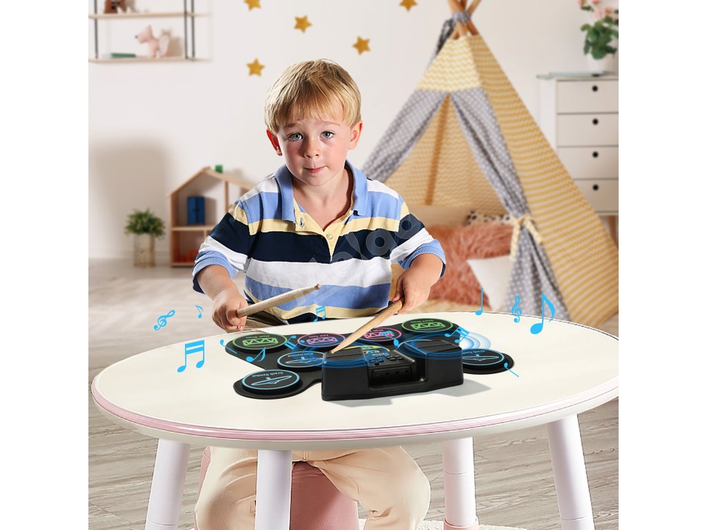 Naša bubnová súprava pre deti obsahuje zabudovanú nabíjateľnú batériu, vďaka ktorej ju môžete ľahko použiť všade, kam sa vaše dieťa vyberie, aj bez elektrickej zásuvky! Je kompaktná a vhodná na cvičenie na rôznych miestach, či už doma alebo na výlete v kempe.
