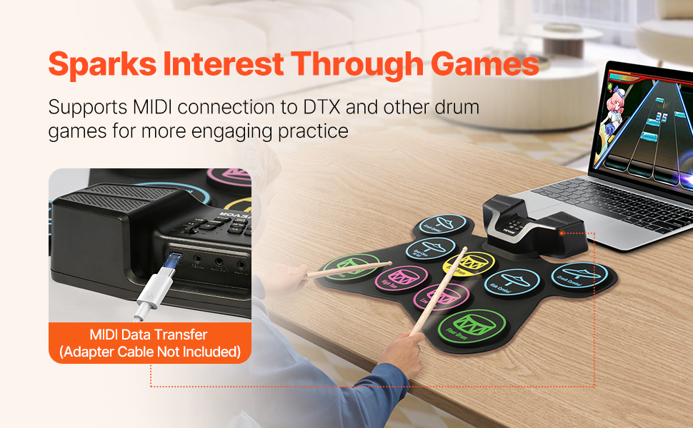 Vďaka podpore MIDI sa naša detská elektrická bicia súprava dá ľahko pripojiť k počítaču alebo iným zariadeniam. Deti tak môžu používať rôzne hudobné softvéry na interaktívne učenie, vďaka čomu je cvičenie vzrušujúcejšie a pútavejšie.