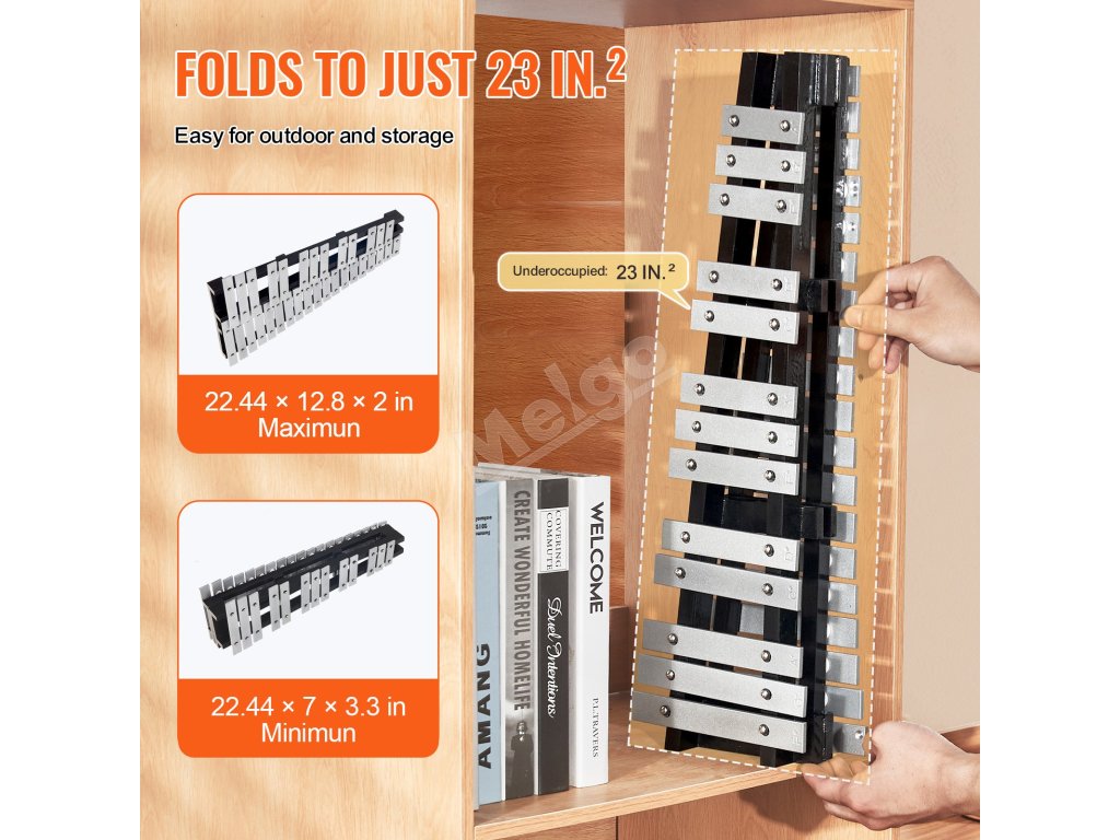 Základňa z prírodného dreva zaisťuje odolnosť aj stabilitu, zatiaľ čo konštrukcia s hranami odolnými proti poškriabaniu ponúka zvýšenú ochranu. Skladacia konštrukcia zmenšuje úložný priestor, vďaka čomu môžete zvonkohru jednoducho umiestniť do rohu, a jej menšie rozmery ju robia veľmi pohodlnou na prenášanie v exteriéri.