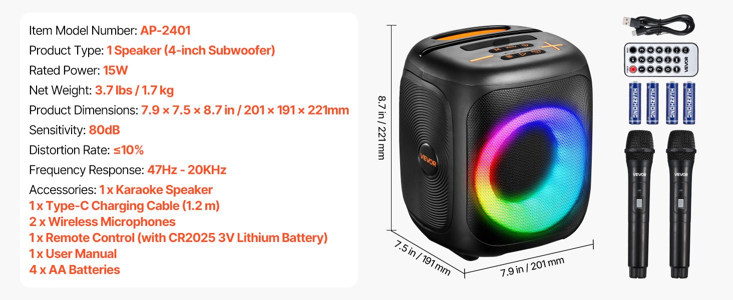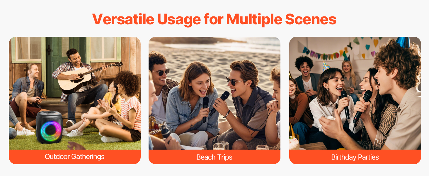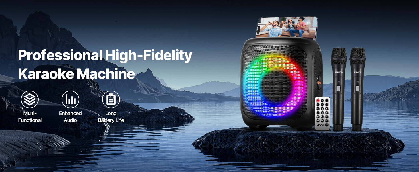 Náš prenosný karaoke stroj je určený na domácu zábavu a malé až stredne veľké spoločenské podujatia. Vďaka 2 bezdrôtovým mikrofónom a pripojeniu 5.1 TWS Bluetooth môžete spievať spolu s hudobným sprievodom a vychutnať si karaoke na profesionálnej úrovni kdekoľvek a kedykoľvek.