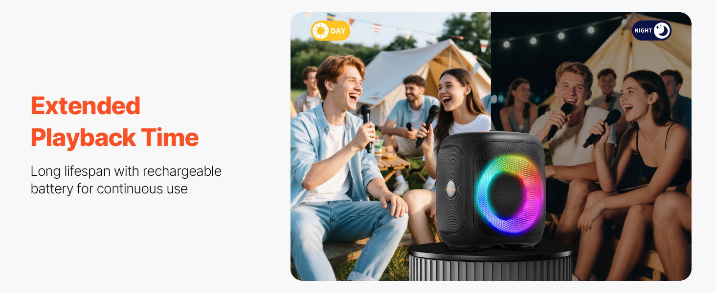 Tento prenosný karaoke stroj je vybavený vstavanou dobíjateľnou batériou s nízkou spotrebou energie, ktorá zabezpečuje nepretržité prehrávanie hudby. Režim nabíjania a prehrávania zaručuje, že nezmeškáte ani jeden rytmus, a to ani počas dlhších karaoke sedení.