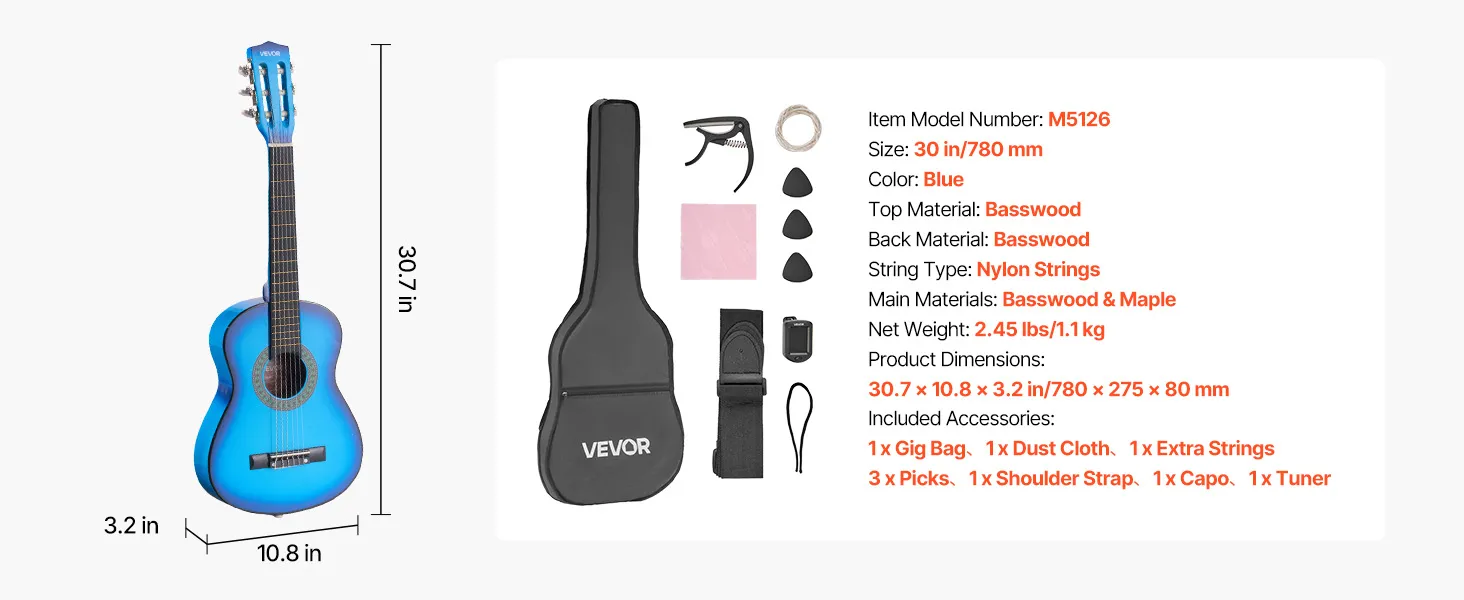 Táto klasická gitara je určená pre začiatočníkov a mladých hudobníkov a kombinuje ručne vyrobenú kvalitu s praktickými funkciami. Vďaka zadnej strane z masívneho dreva, nylonovým strunám a ladičke je hranie a ladenie hračkou. S gig bagom a ďalšími doplnkami obsahuje táto súprava všetko, čo potrebujete na začiatok svojej hudobnej cesty.