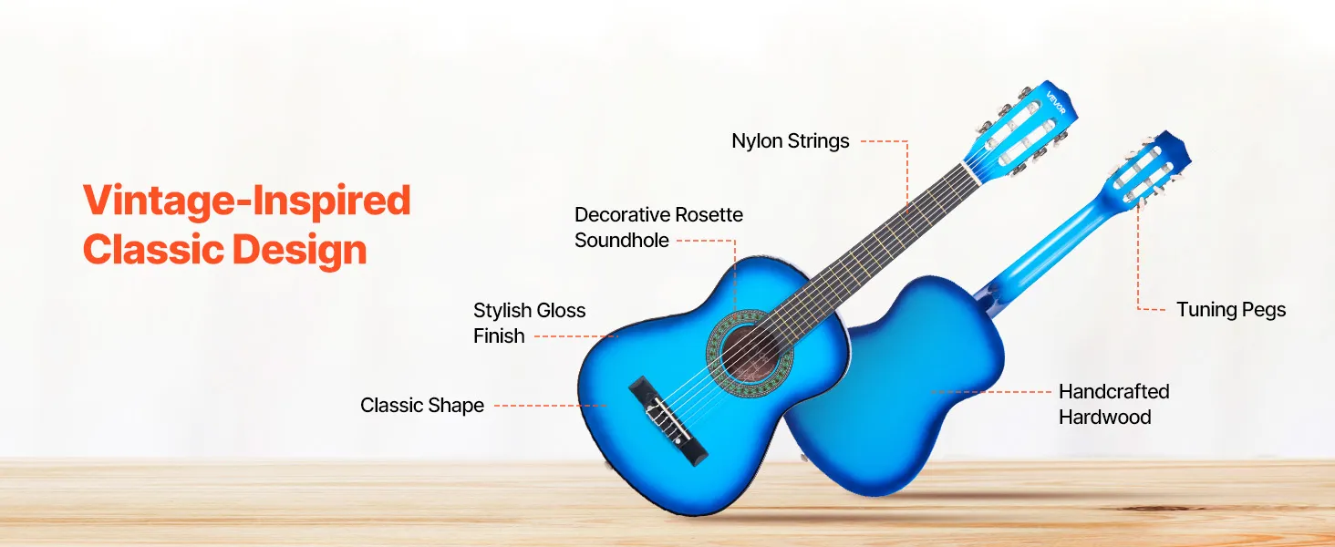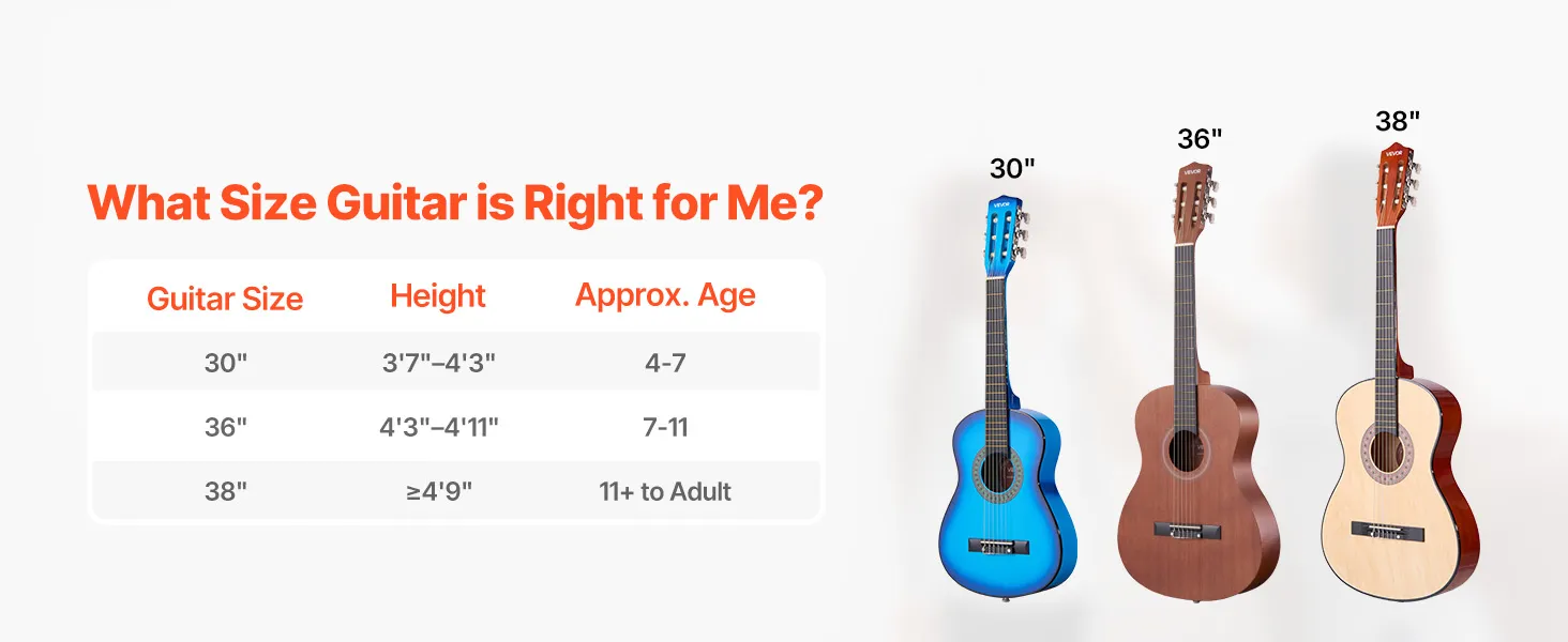Odpoveď: Ponúkame 30", 36" a 38" klasické gitary, ktoré sú vhodné pre hráčov každého veku: 38" Full-Size: pre dospelých a dospievajúcich s výškou od 175 cm. 36" veľkosť: pre deti vo veku 7-11 rokov, výška 4'3"-4'11". 30" veľkosť: pre mladšie deti od 4 do 7 rokov, výška 3'7"-4'3".