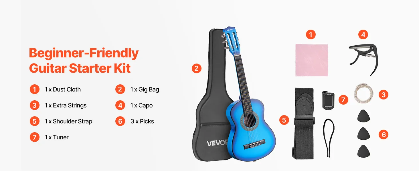 Odpoveď: Áno! Každá gitara sa dodáva s kompletnou sadou základných vecí pre začiatočníkov: taška na gitaru, handrička na utieranie prachu, náhradné struny, popruh, kapodastr, digitálna ladička a 3 trsátka. Je to kompletná sada pre začiatočníkov - ideálna pre začínajúcich hráčov.