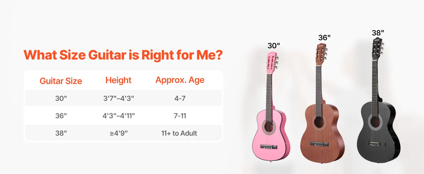 Odpoveď: Ponúkame 30", 36" a 38" klasické gitary, ktoré sú vhodné pre hráčov každého veku: 38" Full-Size: pre dospelých a dospievajúcich s výškou od 175 cm. 36" veľkosť: pre deti vo veku 7-11 rokov, výška 4'3"-4'11". 30" veľkosť: pre mladšie deti od 4 do 7 rokov, výška 3'7"-4'3".