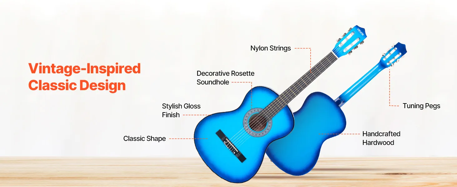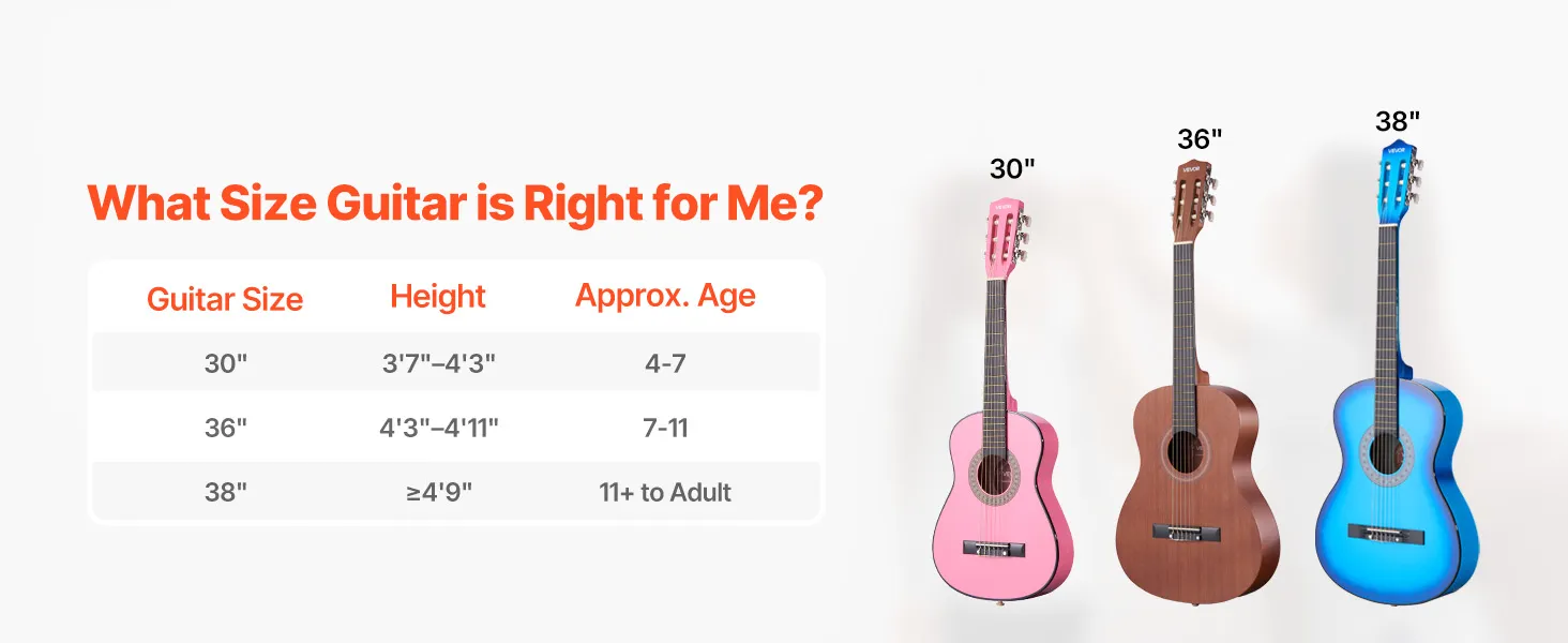 Odpoveď: Ponúkame 30", 36" a 38" klasické gitary, ktoré sú vhodné pre hráčov každého veku: 38" Full-Size: pre dospelých a dospievajúcich s výškou od 175 cm. 36" veľkosť: pre deti vo veku 7-11 rokov, výška 4'3"-4'11". 30" veľkosť: pre mladšie deti od 4 do 7 rokov, výška 3'7"-4'3".