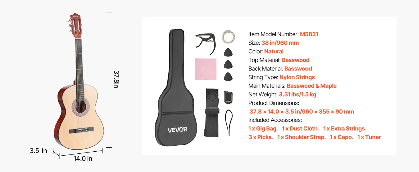 38-palcová súprava klasickej gitary pre začiatočníkov