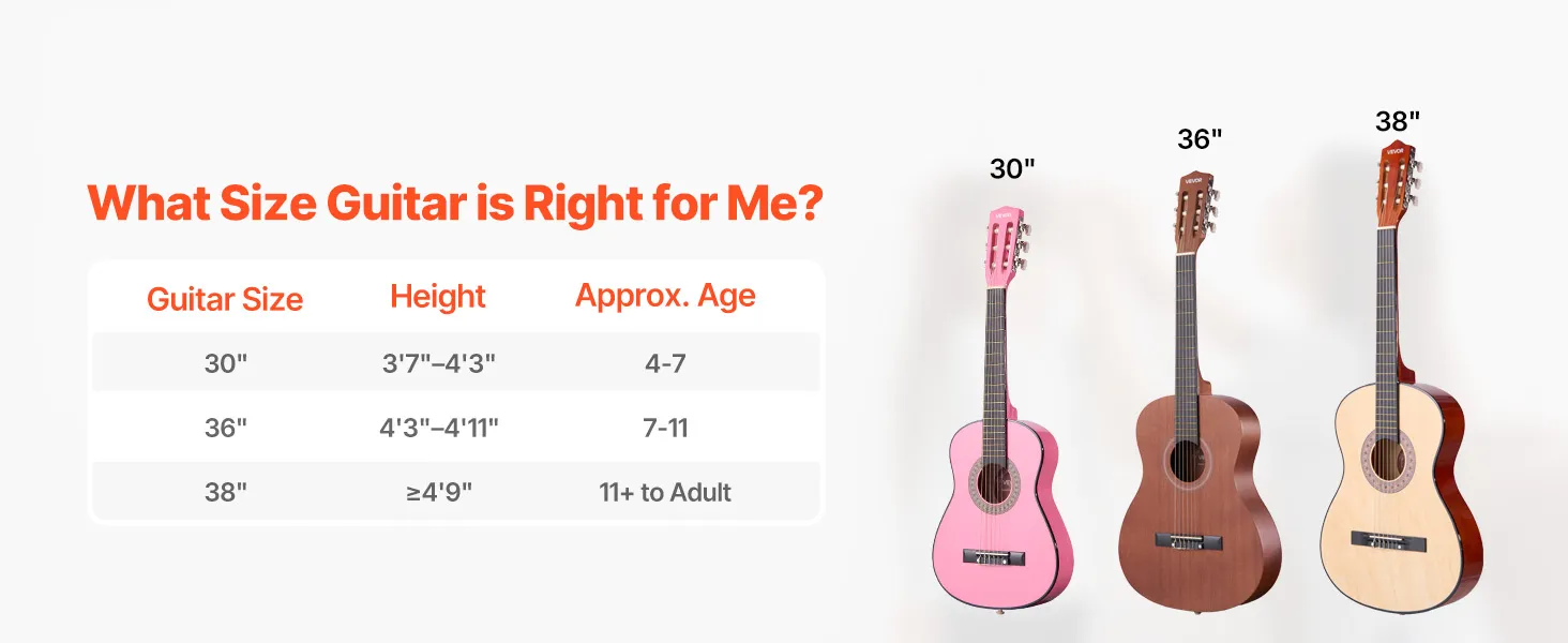 Odpoveď: Ponúkame 30", 36" a 38" klasické gitary, ktoré sú vhodné pre hráčov každého veku: 38" Full-Size: pre dospelých a dospievajúcich s výškou od 175 cm. 36" veľkosť: pre deti vo veku 7-11 rokov, výška 4'3"-4'11". 30" veľkosť: pre mladšie deti od 4 do 7 rokov, výška 3'7"-4'3".