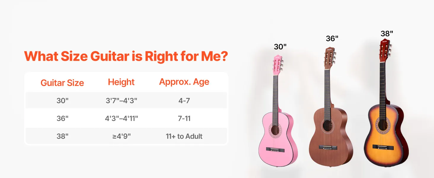 Odpoveď: Ponúkame 30", 36" a 38" klasické gitary, ktoré sú vhodné pre hráčov každého veku: 38" Full-Size: pre dospelých a dospievajúcich s výškou od 175 cm. 36" veľkosť: pre deti vo veku 7-11 rokov, výška 4'3"-4'11". 30" veľkosť: pre mladšie deti od 4 do 7 rokov, výška 3'7"-4'3".