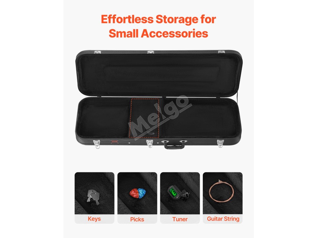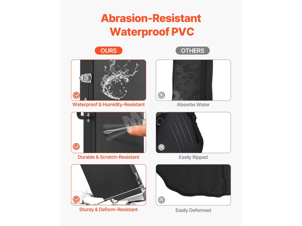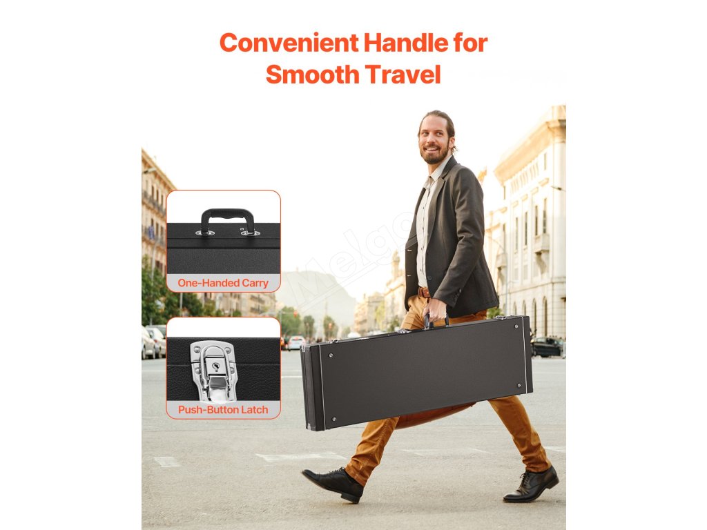 Toto obdĺžnikové tvrdé puzdro na gitaru, vybavené vonkajším povrchom potiahnutým PVC, je vodotesné a odolné voči vlhkosti, čím chráni vašu gitaru pred vlhkosťou a koróziou. Či už je slnečno, alebo prší, môžete ho bez obáv prenášať a hrať.
