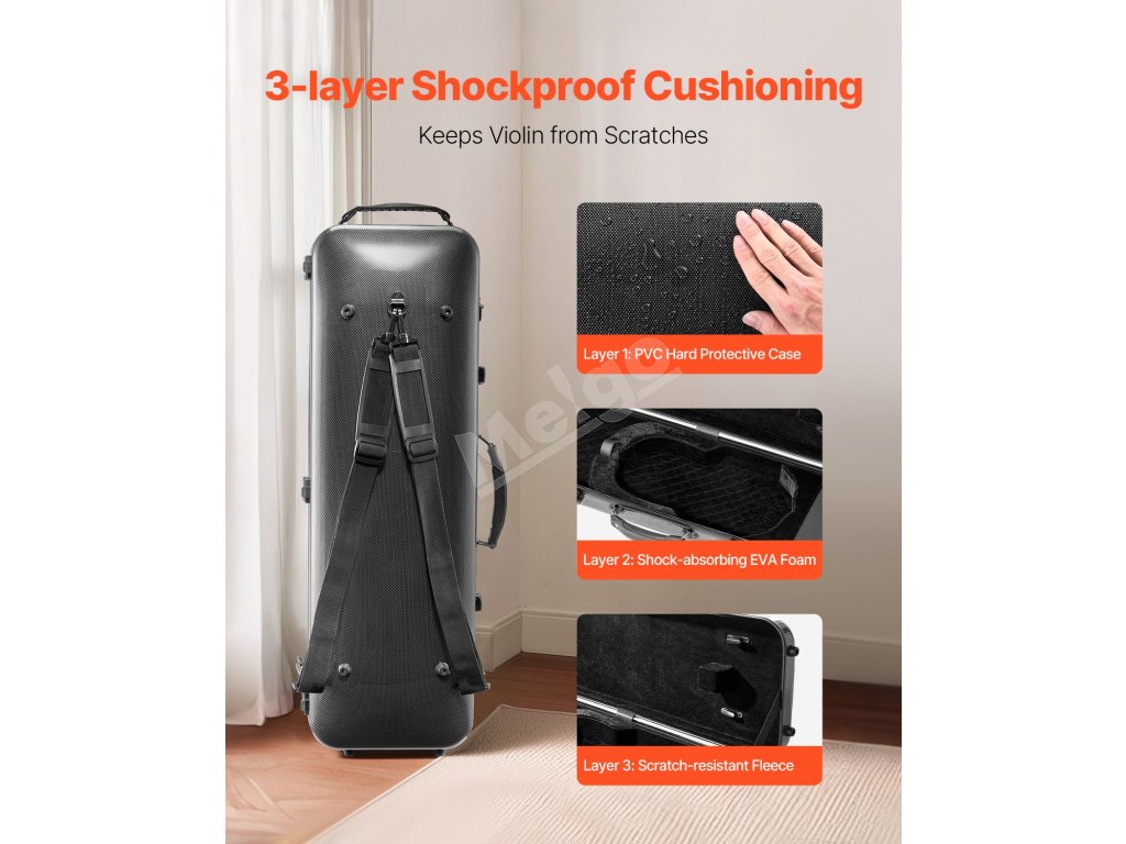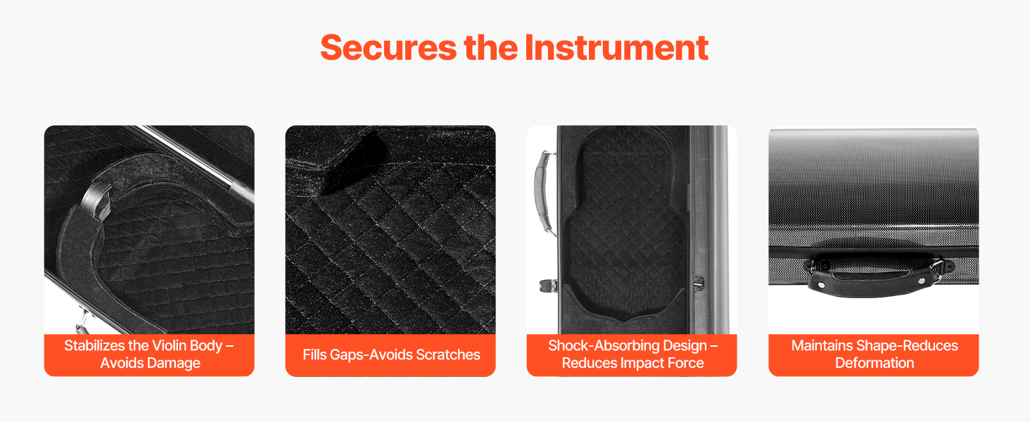 Toto puzdro na 4/4 husle je navrhnuté s praktickou podložkou na zavesenie, ktorá pomáha znižovať nárazy spôsobené pohybom počas cestovania. Vypĺňa tiež priestor medzi husľami a vnútrom puzdra, čím pomáha predchádzať otrasom, treniu alebo povrchovým stopám na ceste.