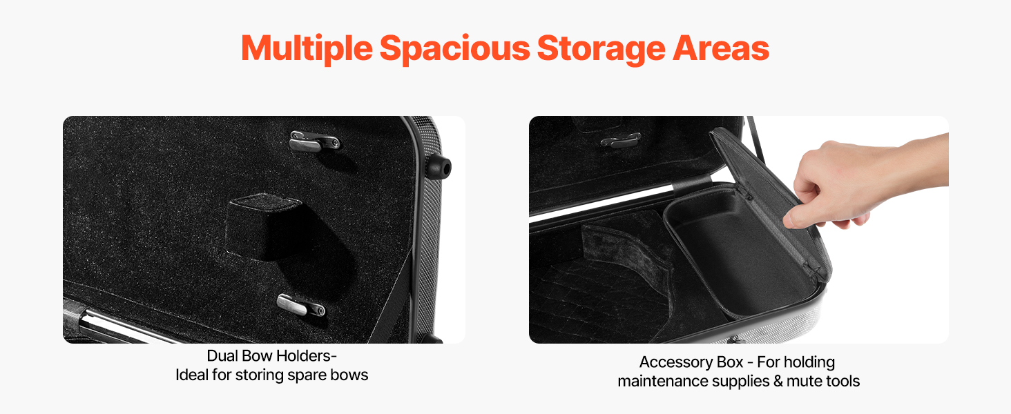 Taška na husľové puzdro umožňuje jednoduché uloženie náhradného sláčika, zatiaľ čo priestranná schránka na príslušenstvo umožňuje prehľadné uloženie mut, ladičiek a ďalších nevyhnutností.