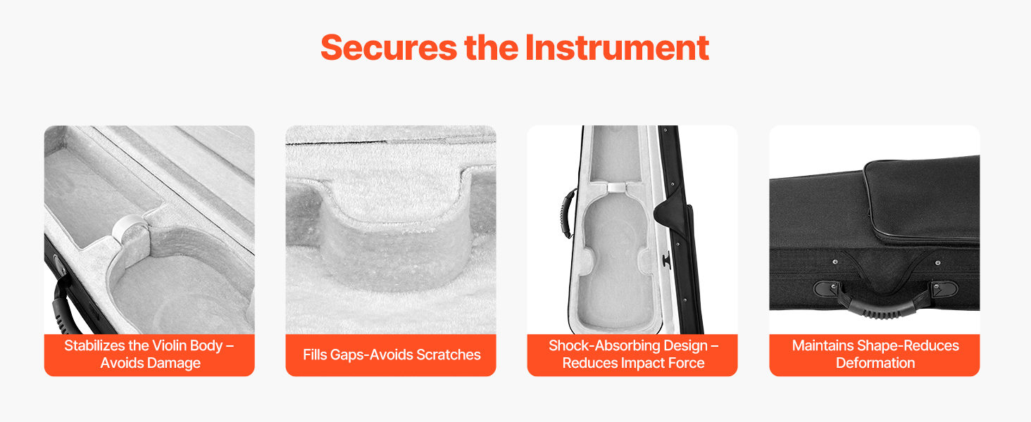 Toto puzdro na 4/4 husle je navrhnuté s praktickou podložkou na zavesenie, ktorá pomáha znižovať nárazy spôsobené pohybom počas cestovania. Vypĺňa tiež priestor medzi husľami a vnútrom puzdra, čím pomáha predchádzať otrasom, treniu alebo povrchovým stopám na ceste.