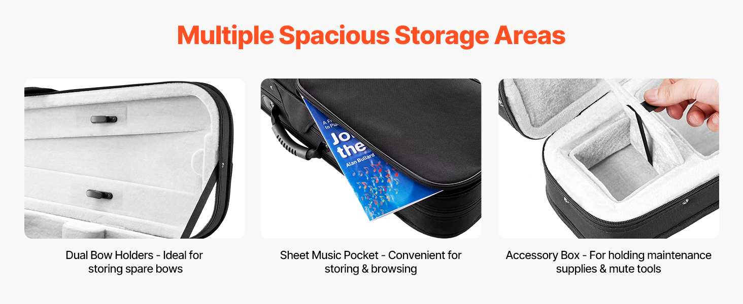 Puzdro na husle je vybavené dvojitým držiakom sláčika, ktorý umožňuje jednoduché uloženie náhradného sláčika, zatiaľ čo vrecko na noty poskytuje rýchly prístup k notám. Schránka na príslušenstvo poskytuje dostatok priestoru na prehľadné uloženie mutácií, ladiacich nástrojov a ďalších potrebných vecí.