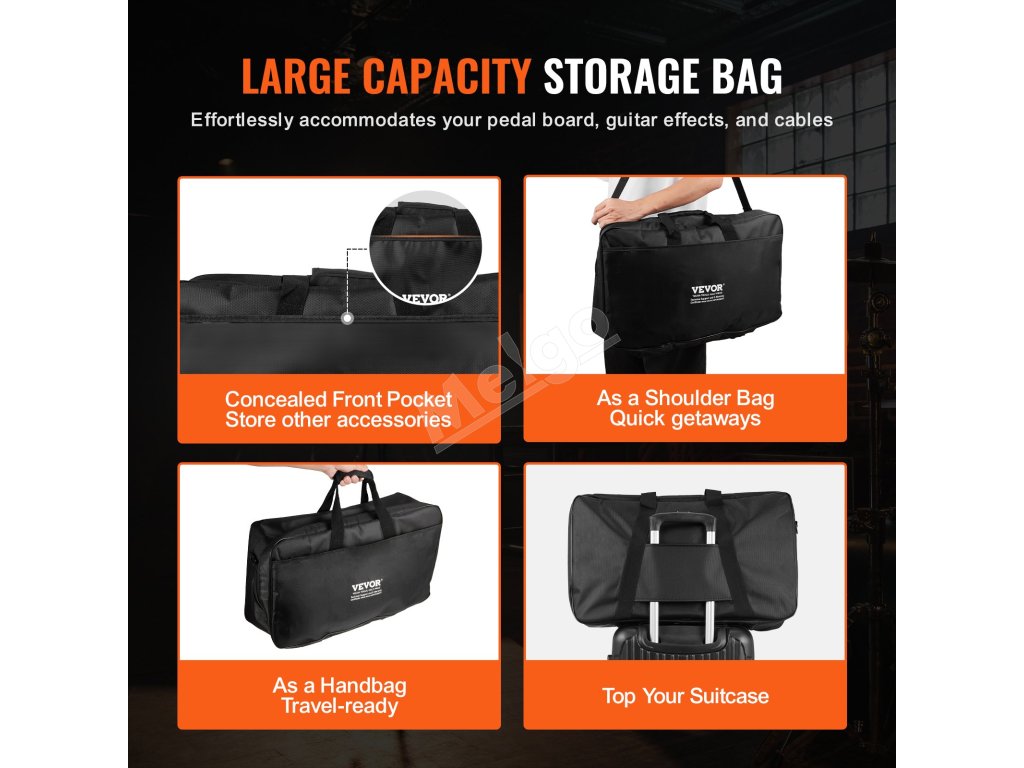 Náš gitarový efektový pedálový board je vybavený veľkokapacitnou úložnou taškou, ktorá slúži ako kabelka alebo taška cez rameno. Je tiež kompatibilná s batožinou na jednoduchú prepravu. Vďaka dodatočným bočným vreckám na uloženie príslušenstva je navyše ideálna pre hudobníkov na cestách.