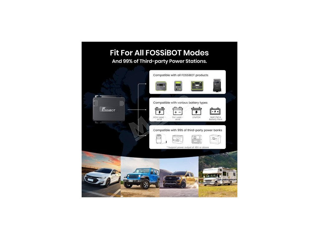 Nabíjačka FAC580 je navrhnutá tak, aby sa hodila pre všetky modely FOSSiBOT a 99 % napájacích staníc iných výrobcov, a zaručuje tak bezproblémovú integráciu s vašimi existujúcimi riešeniami napájania. Je kompatibilný s rôznymi typmi batérií vrátane olovených batérií AGM, gélových olovených batérií, batérií LiFePO4 a batérií NMC/NCA, čo z neho robí univerzálnu voľbu pre rôzne typy vozidiel a potreby napájania.