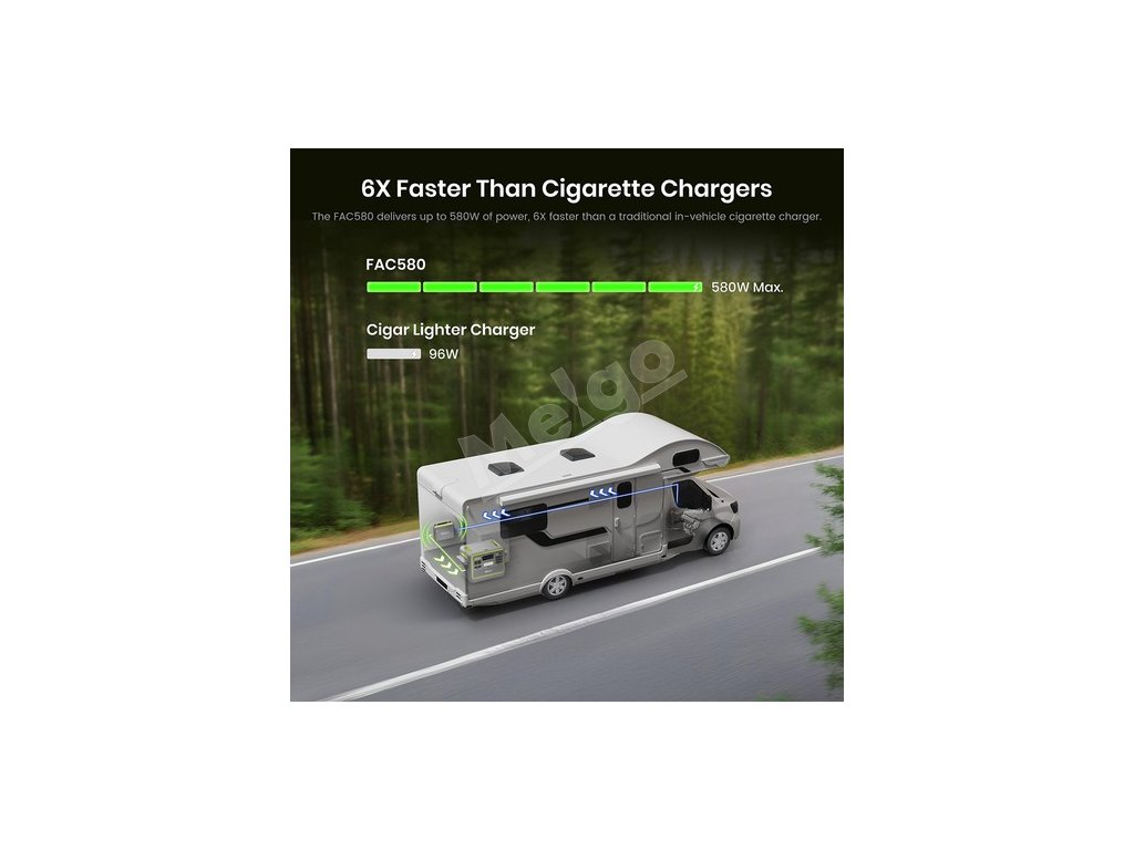 Nabíjačka FOSSiBOT FAC580 s alternátorom dodáva až 580 W výkonu, čím nabíja 6-krát rýchlejšie ako tradičné nabíjačky na cigarety vo vozidle. Toto vysokoúčinné nabíjanie zaručuje, že vaše zariadenia budú vždy pripravené na použitie, či už ste na dlhom výlete, alebo rýchlo dochádzate do práce.