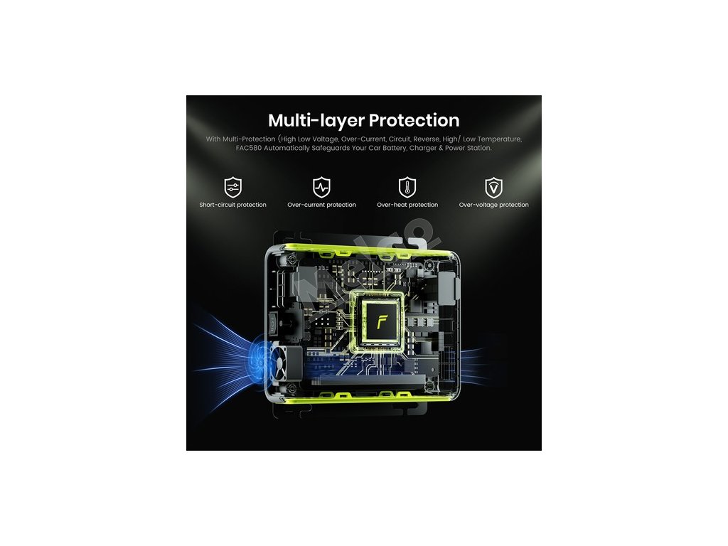 Vybavený viacvrstvovou ochranou vrátane ochrany proti skratu, nadprúdu, prehriatiu a prepätiu, FAC580 automaticky chráni autobatériu, nabíjačku a napájaciu stanicu. To zakaždým zaručuje bezpečné a spoľahlivé nabíjanie, vďaka čomu budete mať na cestách pokoj.