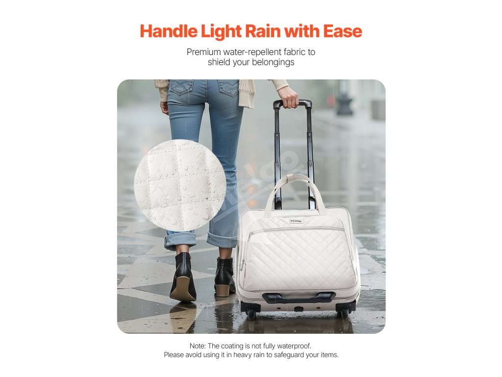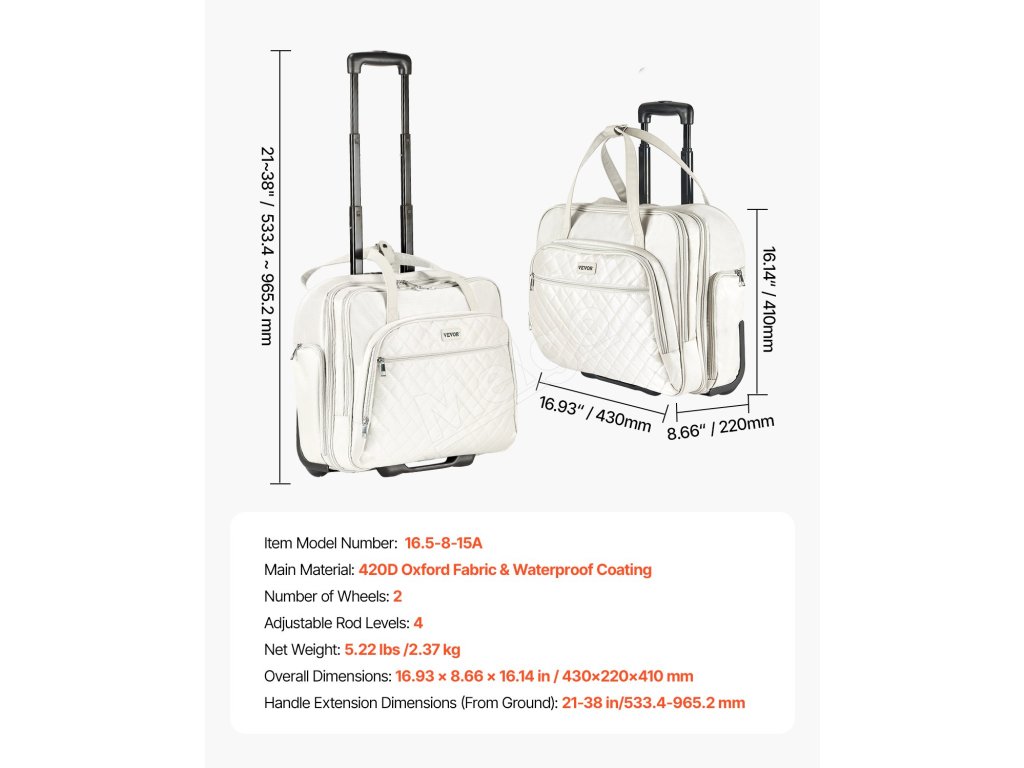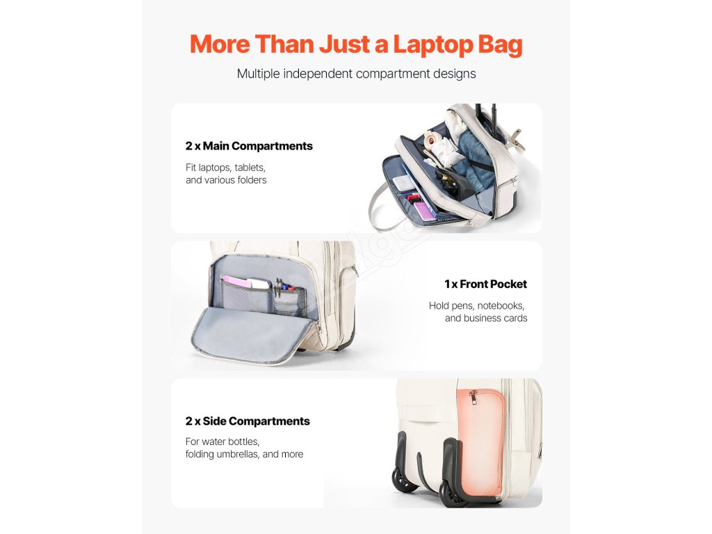 Táto taška na notebook na kolieskach je vhodná pre notebooky s veľkosťou 15,6 palca a je vybavená teleskopickou rukoväťou so 4 výškami na jednoduché cestovanie. Vďaka viacerým priehradkám a vrecku s rýchlym prístupom udrží potrebné veci usporiadané. Je vyrobená z odolnej tkaniny 420D Oxford s nepremokavou povrchovou úpravou a ochráni vaše veci pred ľahkým dažďom.