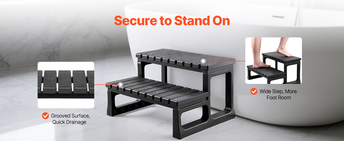 Horizontálne drenážne drážky urýchľujú schnutie a pomáhajú znižovať riziko pošmyknutia. Mimoriadne široké stupne poskytujú dostatočnú oporu pre pohodlnejší postoj.