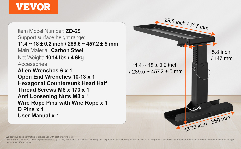 | Rozsah výšky podpornej plochy | 11.4 - 18 ± 0,2 palca / 289,5 - 457,2 ± 5 mm |