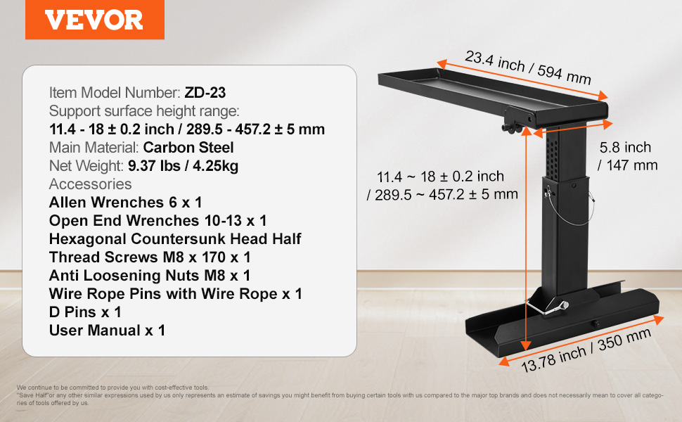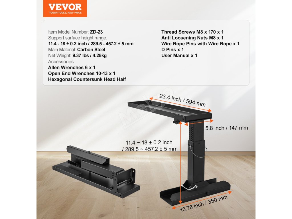 | Rozsah výšky podpornej plochy | 11.4 - 18 ± 0,2 palca / 289,5 - 457,2 ± 5 mm |