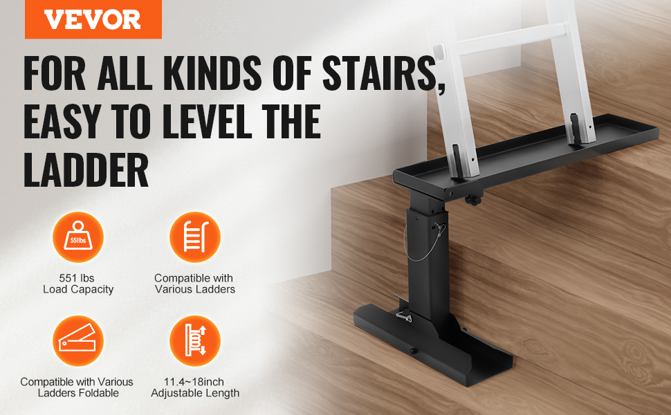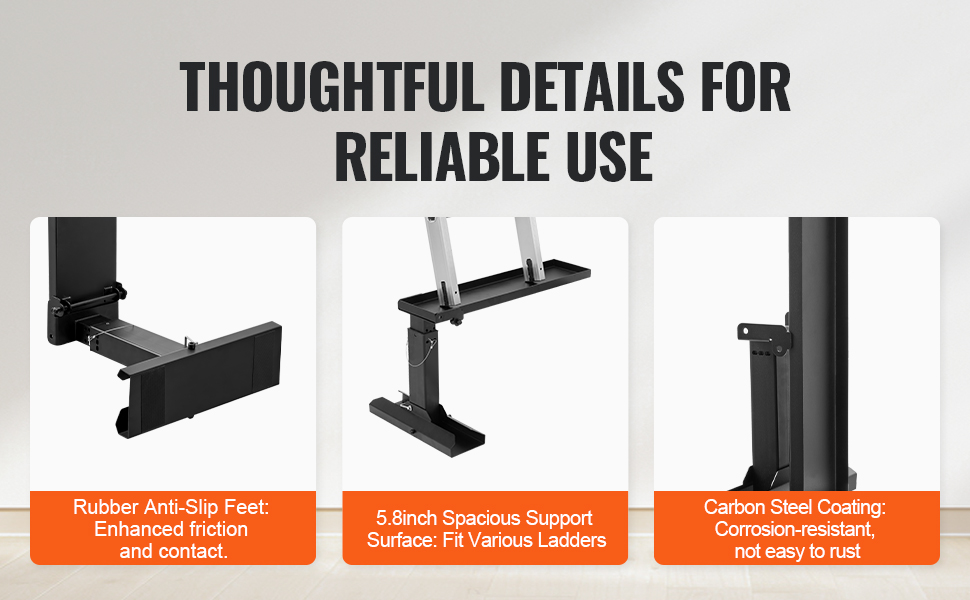 Protišmykové gumové nožičky zlepšujú kontakt so zemou pre stabilitu. Široká oporná plocha sa prispôsobí rôznym typom rebríkov. Vyrobené z vysokokvalitnej uhlíkovej ocele pre odolnosť proti korózii a dlhodobú životnosť, každý detail spolupracuje na zaistení bezpečnosti a stability.