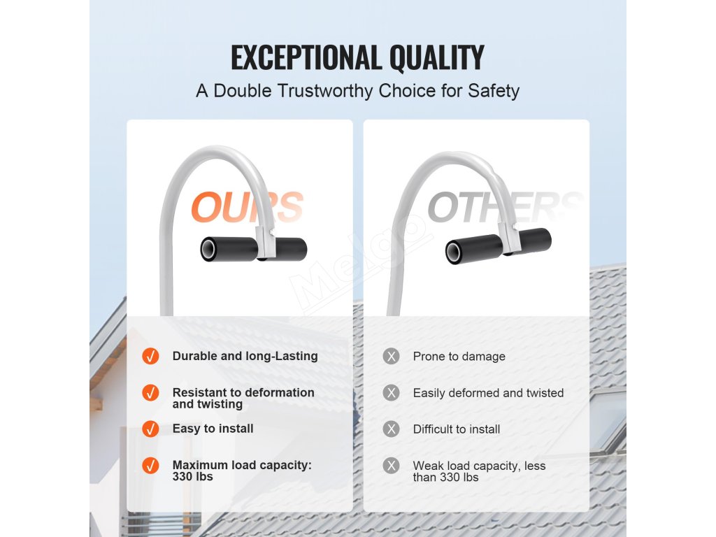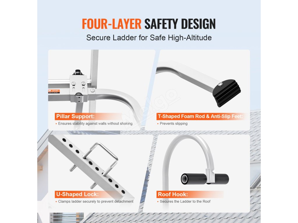 Náš stabilizátor rebríka, ktorý je určený na viacero použití, umožňuje jednoduchú a bezpečnú prácu vo výškach. Ideálny na čistenie striech, vonkajšie úlohy, renovácie v interiéri a exteriérové dekorácie. Poznámka: Neodporúča sa na strechy s vetranými hrebeňmi.