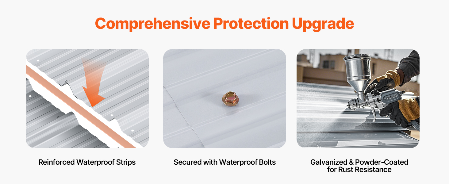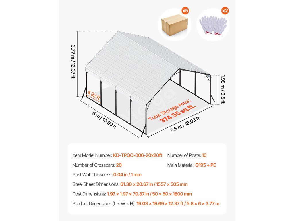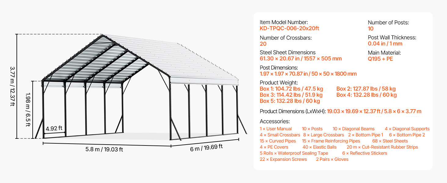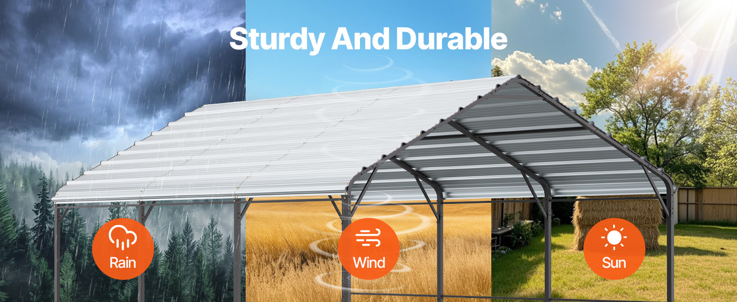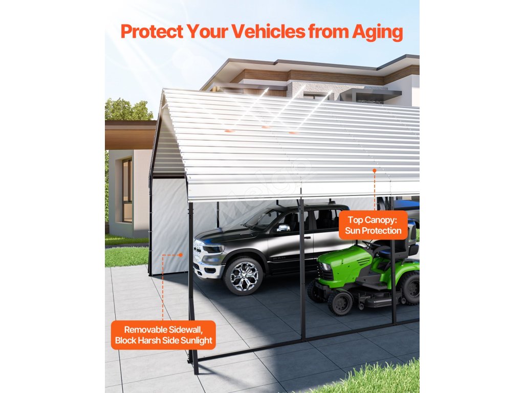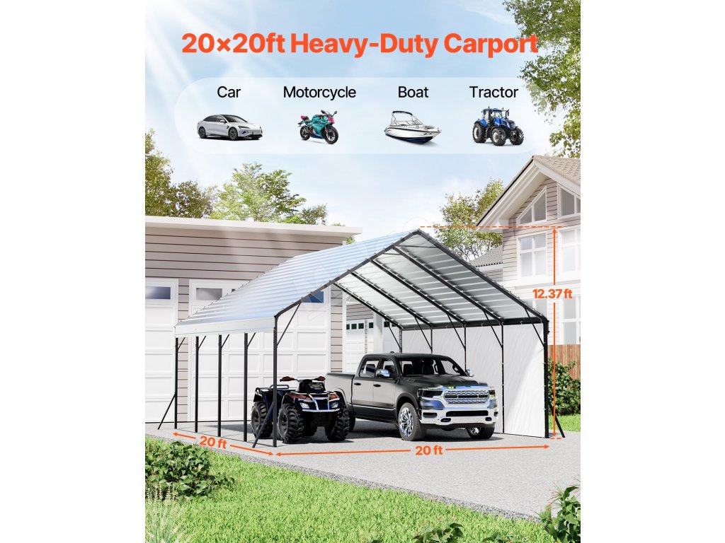 Tento prístrešok pre ťažké vozidlá s rozmermi 20 x 20 stôp je určený pre rôzne vozidlá a zariadenia a poskytuje úplnú ochranu. Jeho robustný oceľový rám Q195 s vodotesným a antikoróznym náterom. Vrchná ochrana proti slnku a bočnice z PE zabraňujú poškodeniu slnkom, čím sa predlžuje životnosť vozidla a jeho skladovanie.