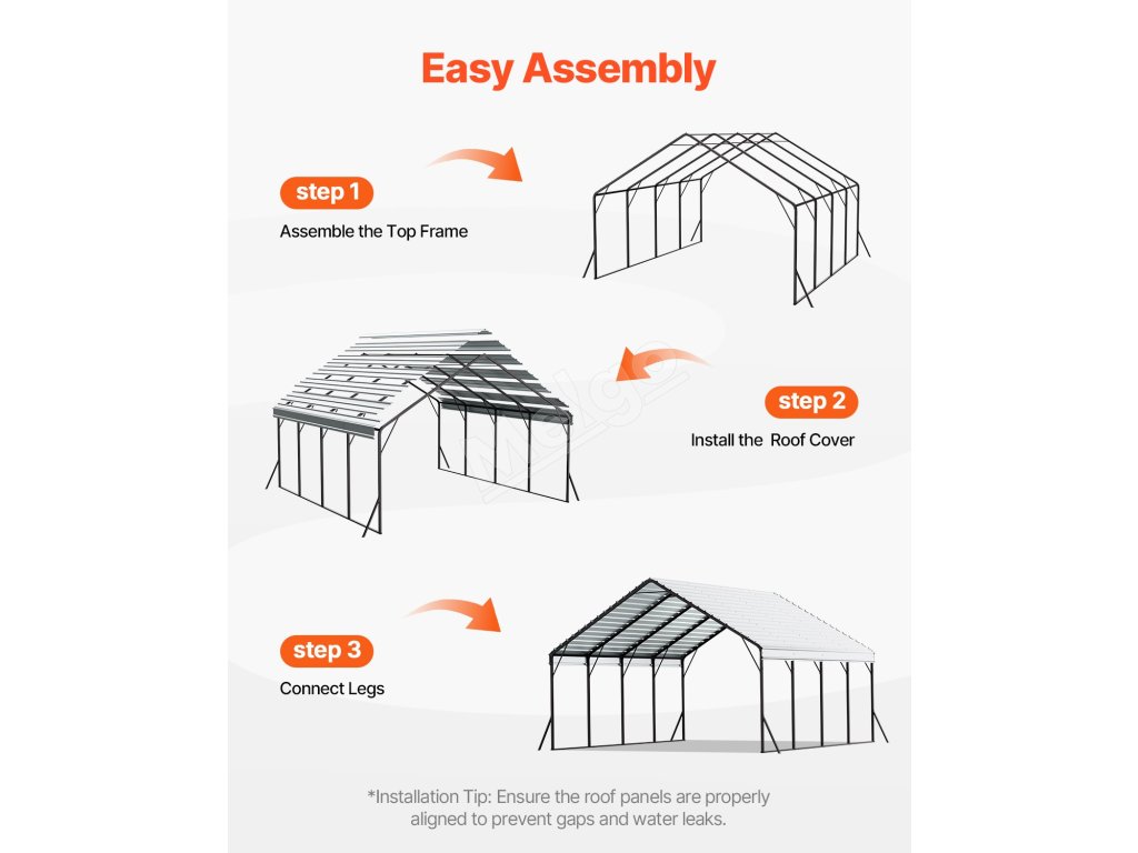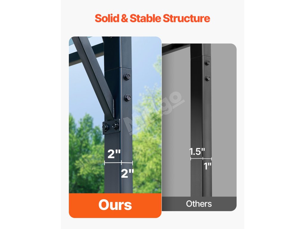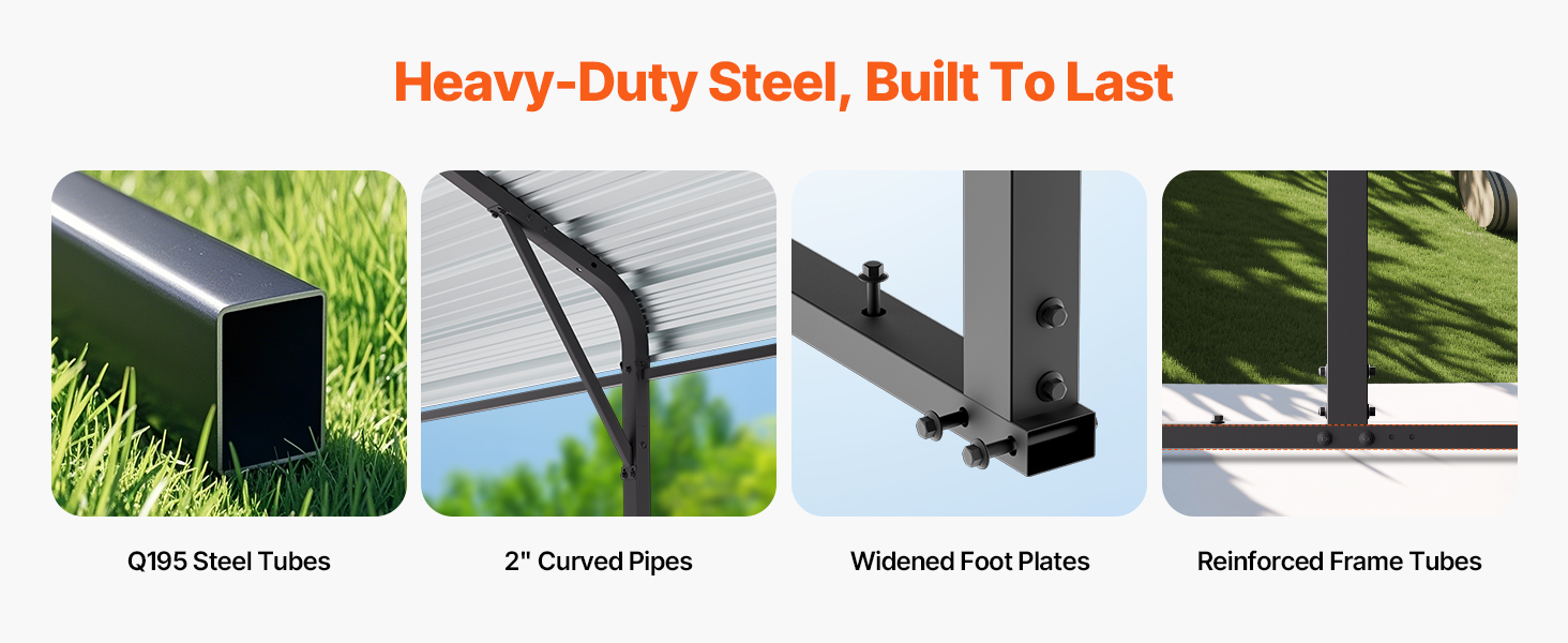 Prístrešok na auto je vyrobený z vysokopevnostnej ocele Q195, 2" ohýbaných rúrok a zosilnených základných dosiek, vďaka čomu zostáva stabilný.