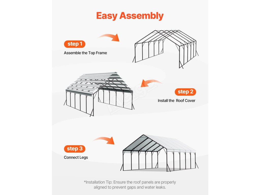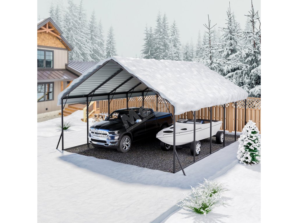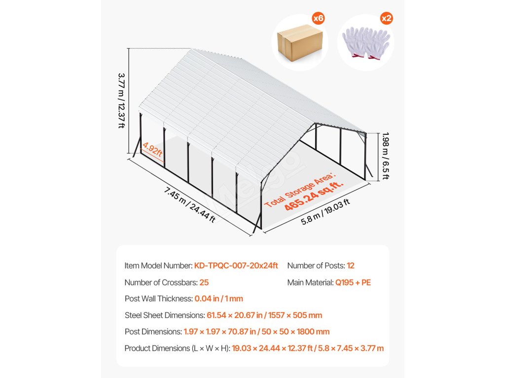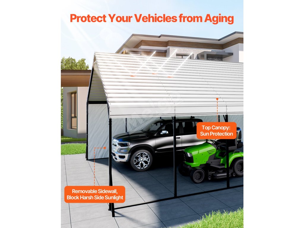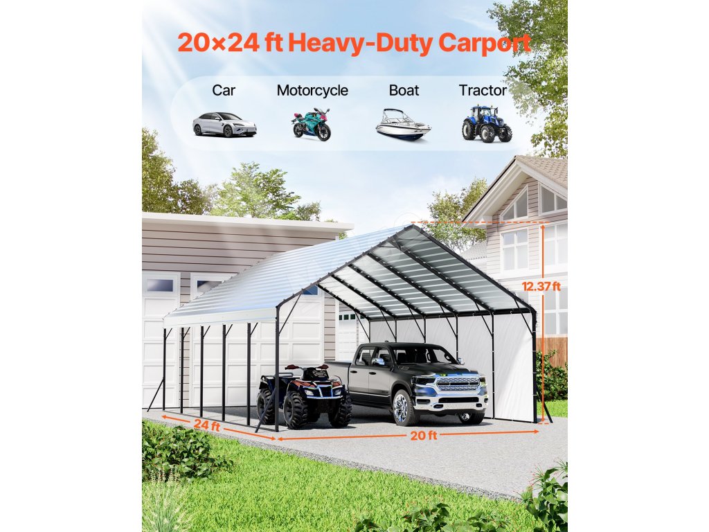 Náš prístrešok na autá s rozmermi 20 × 24 stôp je vhodný pre sedany, SUV a nákladné vozidlá a ponúka dostatok priestoru na ochranu vášho vozidla pred poveternostnými vplyvmi.