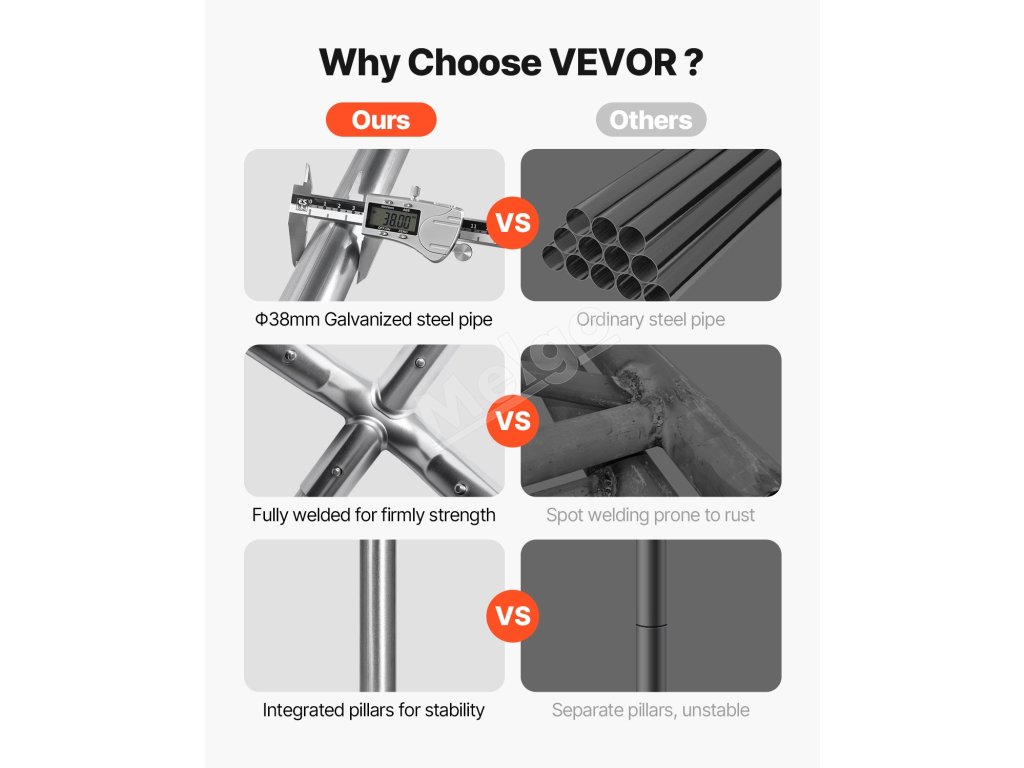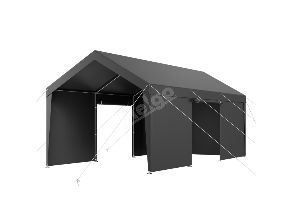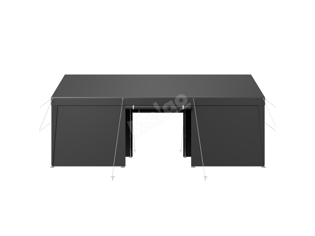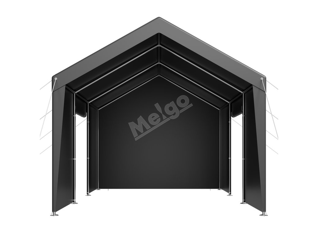 Rám garáže je vyrobený z pozinkovaných oceľových rúrok a je kompletne zváraný na zvýšenie stability. Konštrukcia sa môže pochváliť väčšou odolnosťou proti vetru a nosnosťou. Zhrubnutá základňa spolu s veternými lanami a zemnými kolíkmi zaisťuje pevnú oporu.