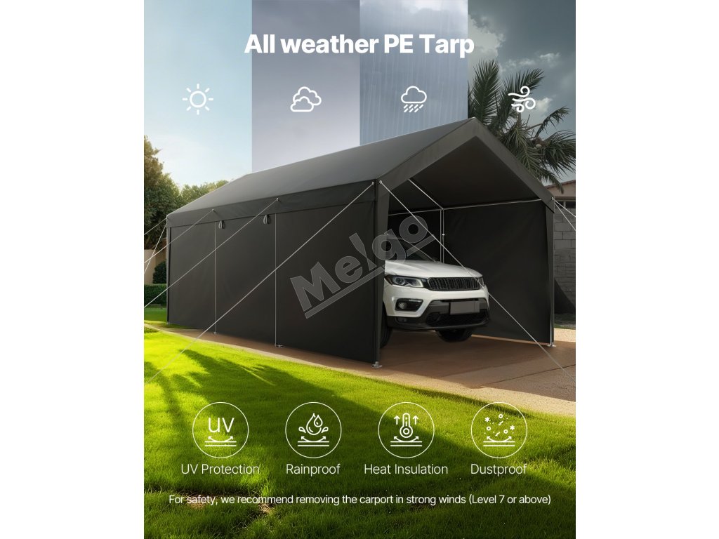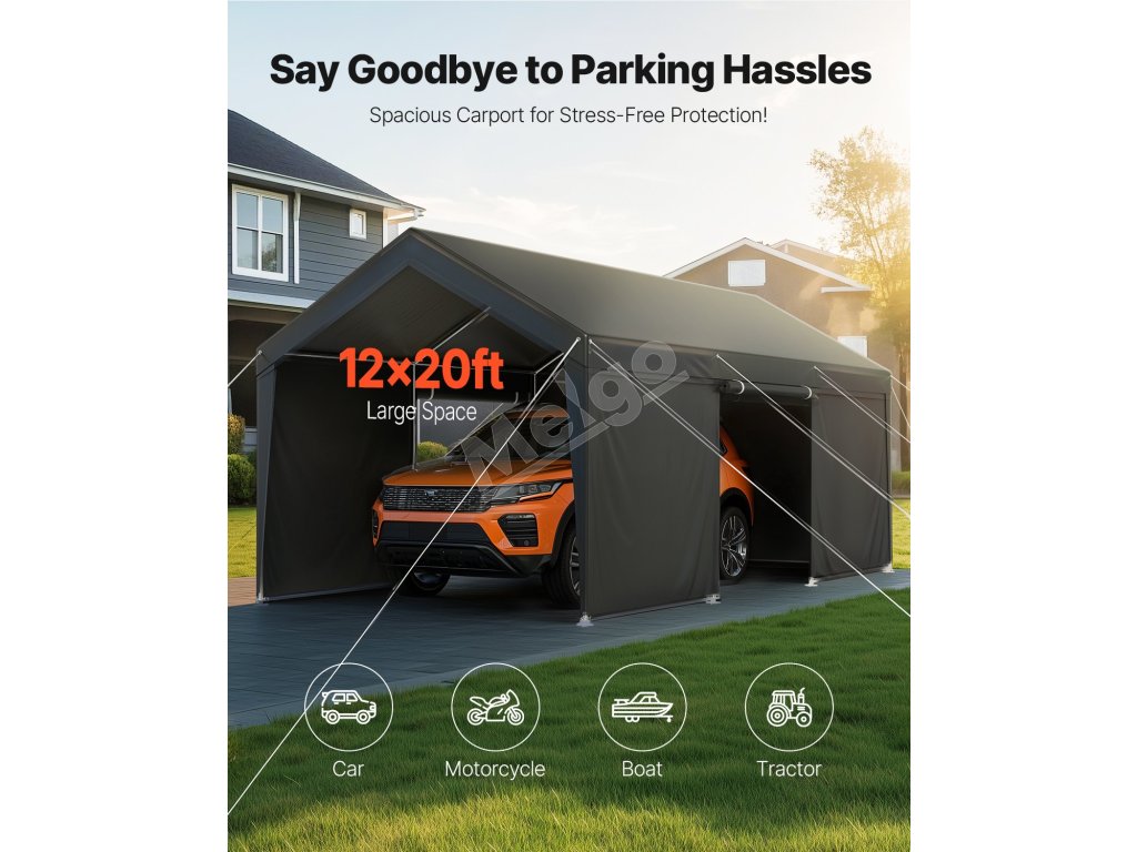 Prenosná garáž ponúka plochu 12 × 20 stôp s pozinkovaným oceľovým rámom a dvojvrstvovou plachtou s PE povlakom, ktorá poskytuje celoročnú ochranu pred slnkom, dažďom a vetrom pre vaše vozidlo a vonkajšie predmety. Rýchla montáž a konštrukcia s dlhou životnosťou, Ideálna pre garáž, skladovací priestor alebo priestor na vonkajšie aktivity.