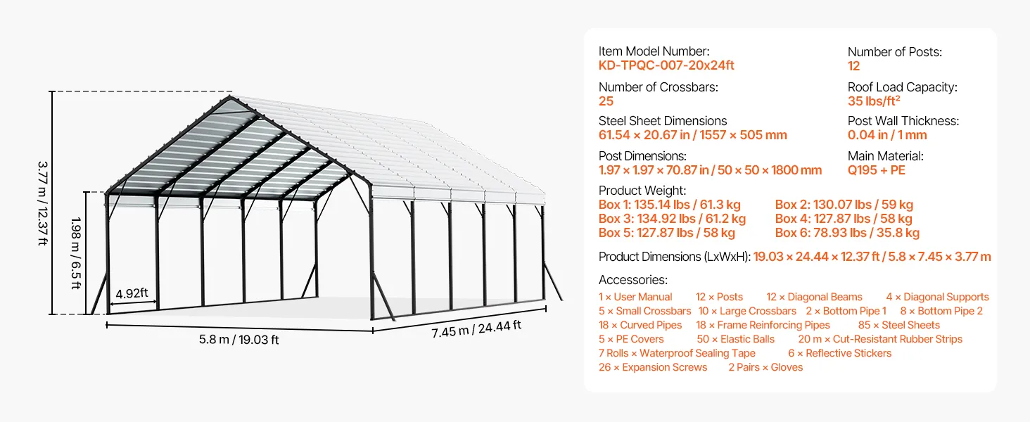 Náš prístrešok na autá s rozmermi 20 × 24 stôp je vhodný pre sedany, SUV a nákladné vozidlá a ponúka dostatok priestoru na ochranu vášho vozidla pred poveternostnými vplyvmi.