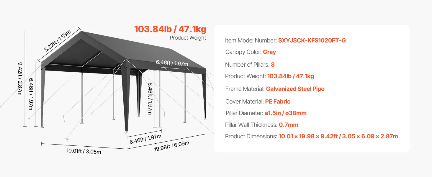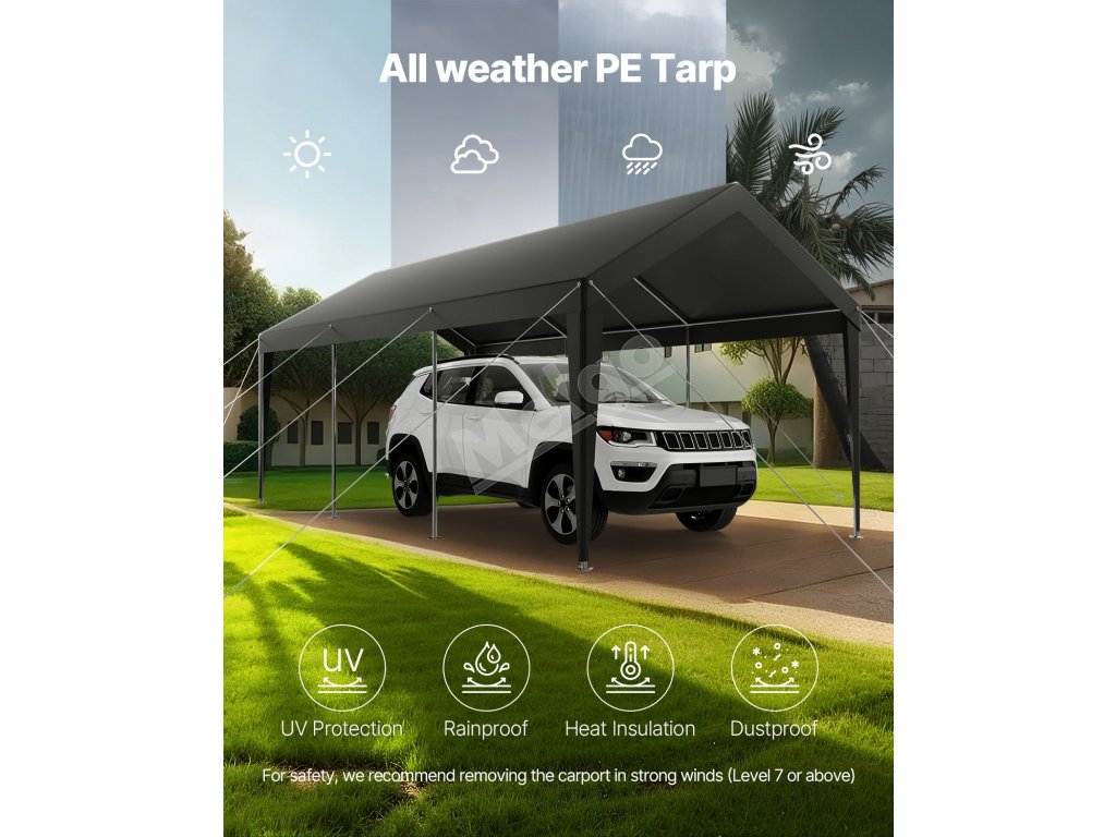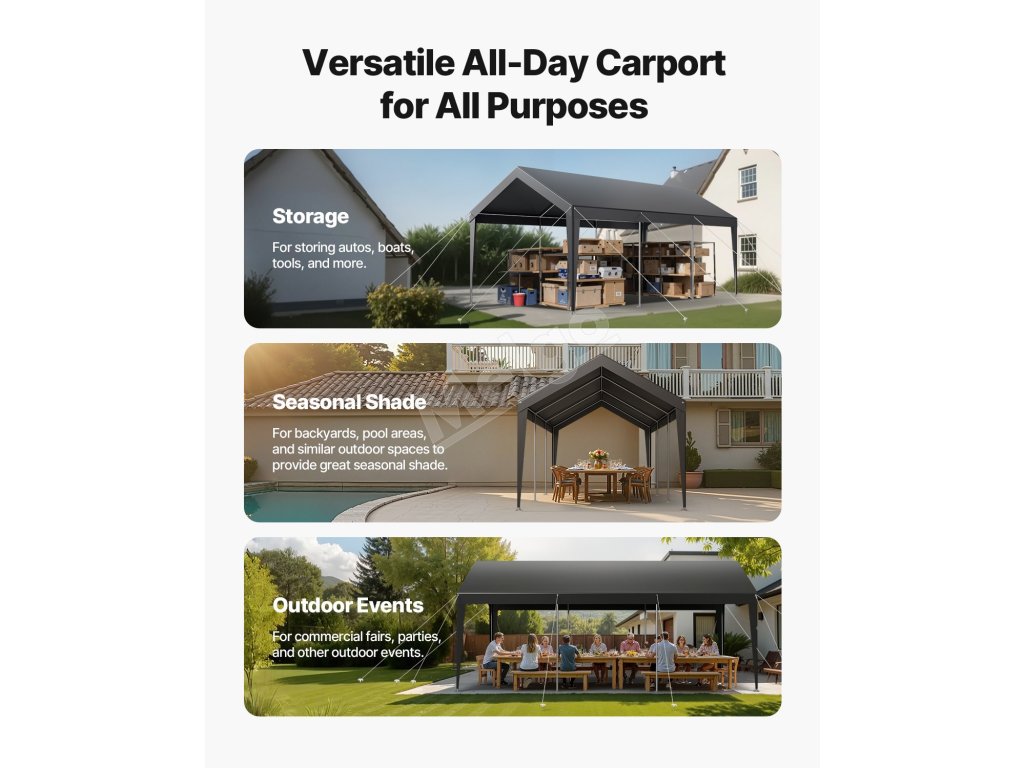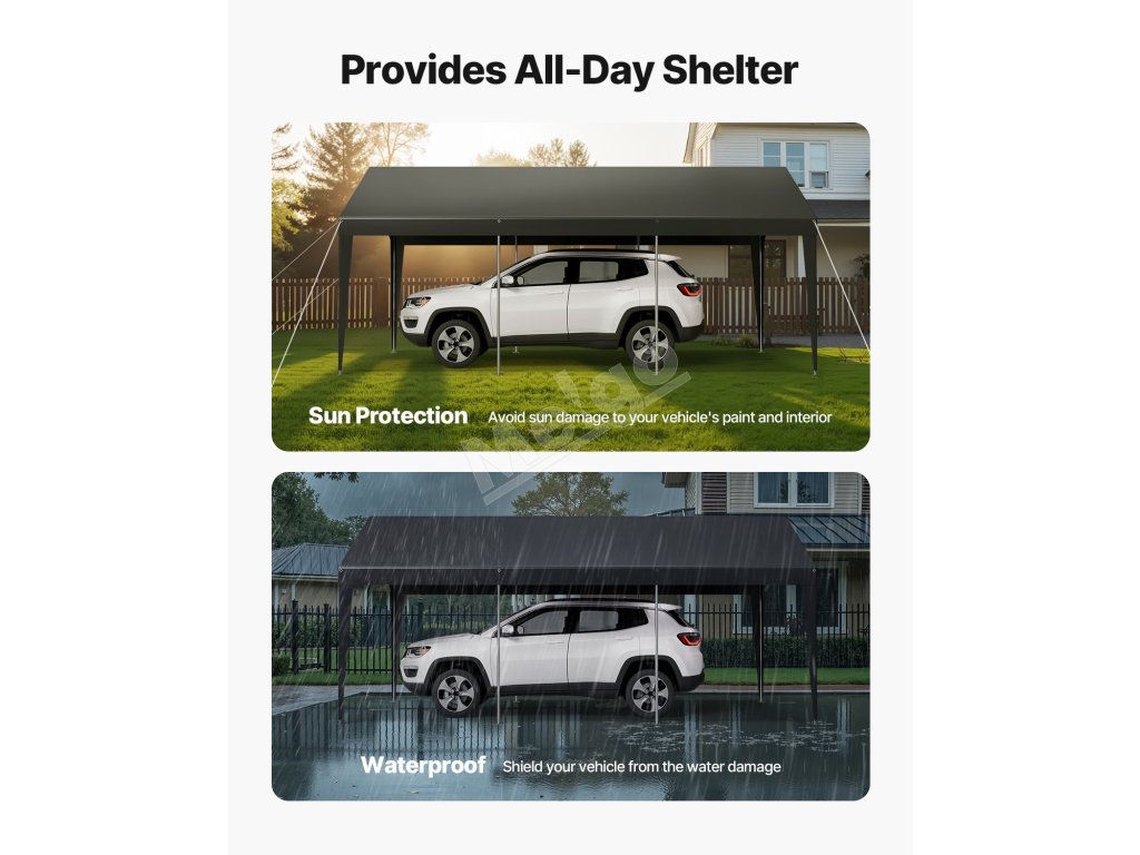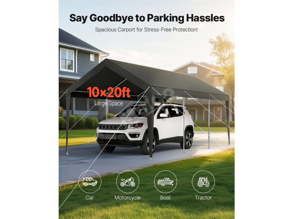 Prenosná garáž ponúka plochu 10 x 20 stôp s pozinkovaným oceľovým rámom a dvojvrstvovou plachtou s PE povlakom, ktorá poskytuje ochranu pred slnkom, nepremokavosť a odolnosť proti vetru na ochranu vášho vozidla a vonkajších predmetov. Rýchlo sa montuje a je skonštruovaný pre dlhú životnosť, ako garáž, skladovací priestor, priestor pre vonkajšie aktivity.