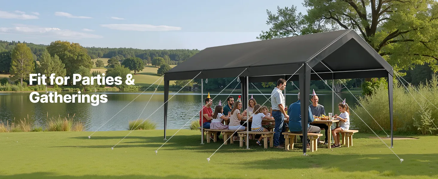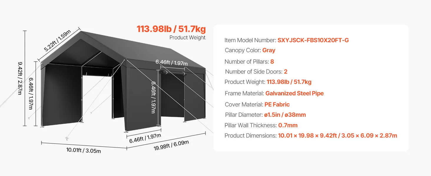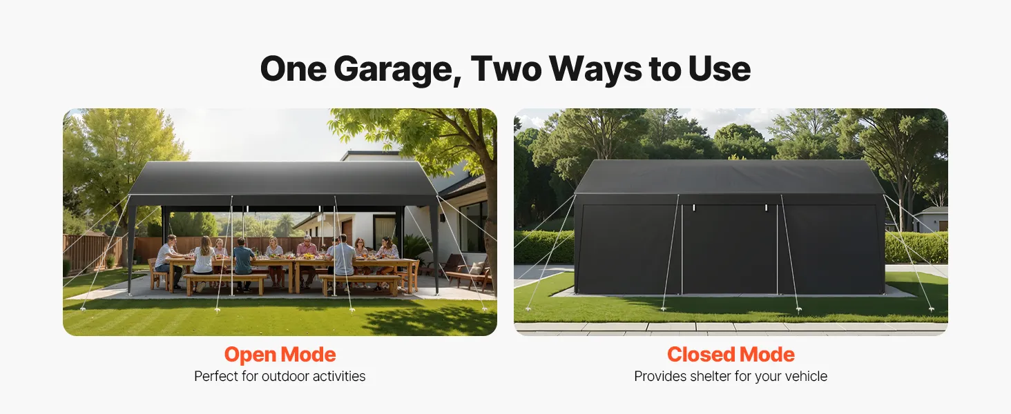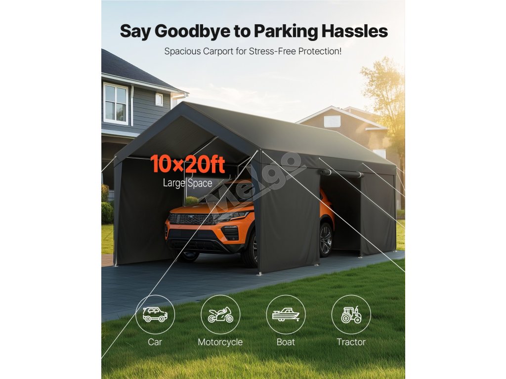 Prístrešok na auto ponúka plochu 10 × 20 ft s pozinkovaným oceľovým rámom a dvojvrstvovou plachtou s PE povlakom, ktorá poskytuje celoročnú ochranu pred slnkom, dažďom a vetrom pre vaše vozidlo a vonkajšie predmety. Rýchlo sa montuje a je skonštruovaný pre dlhú životnosť, Ideálny pre garáž, skladovací priestor alebo priestor pre vonkajšie aktivity.