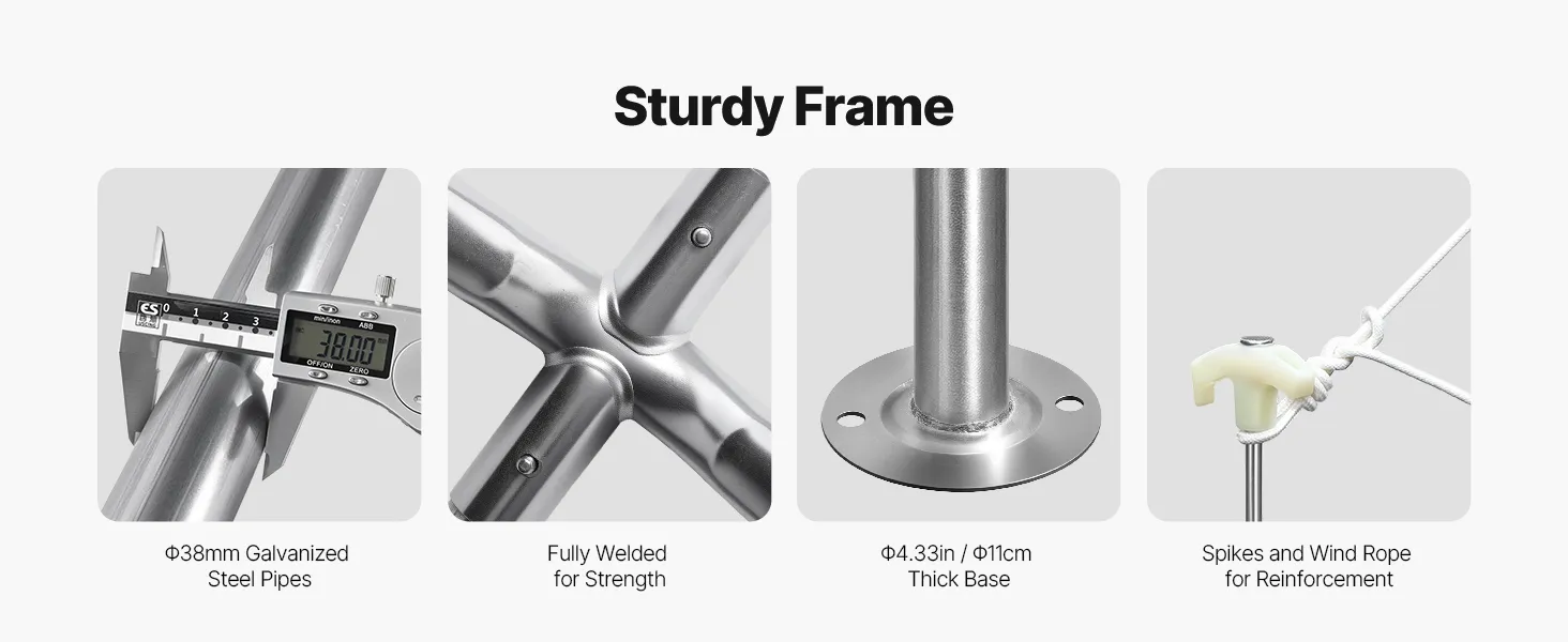 Rám garáže je vyrobený z pozinkovaných oceľových rúrok a je kompletne zváraný na zvýšenie stability. Konštrukcia sa môže pochváliť väčšou odolnosťou proti vetru a nosnosťou. Zhrubnutá základňa spolu s veternými lanami a zemnými kolíkmi zaisťuje pevnú oporu.