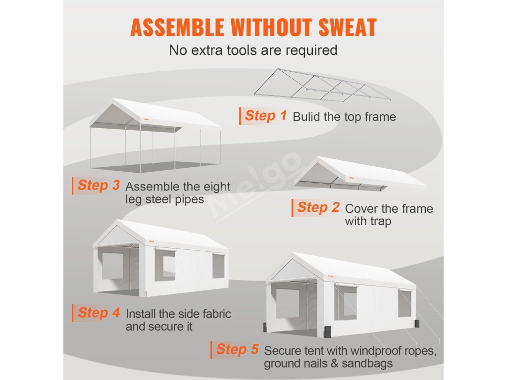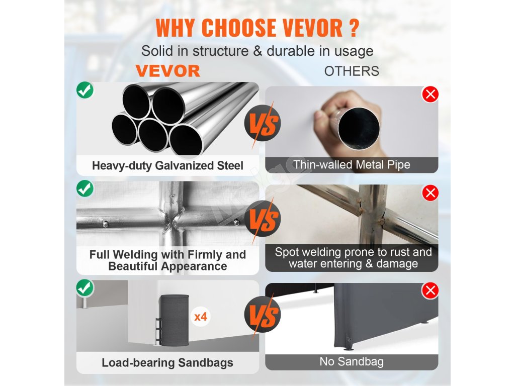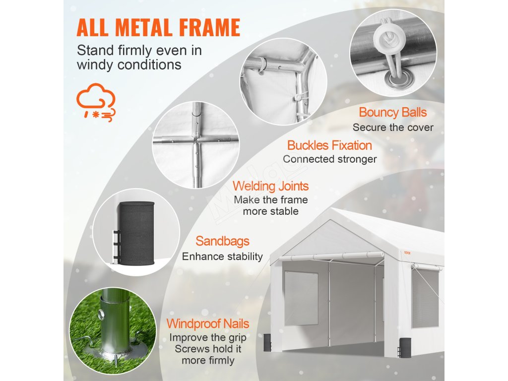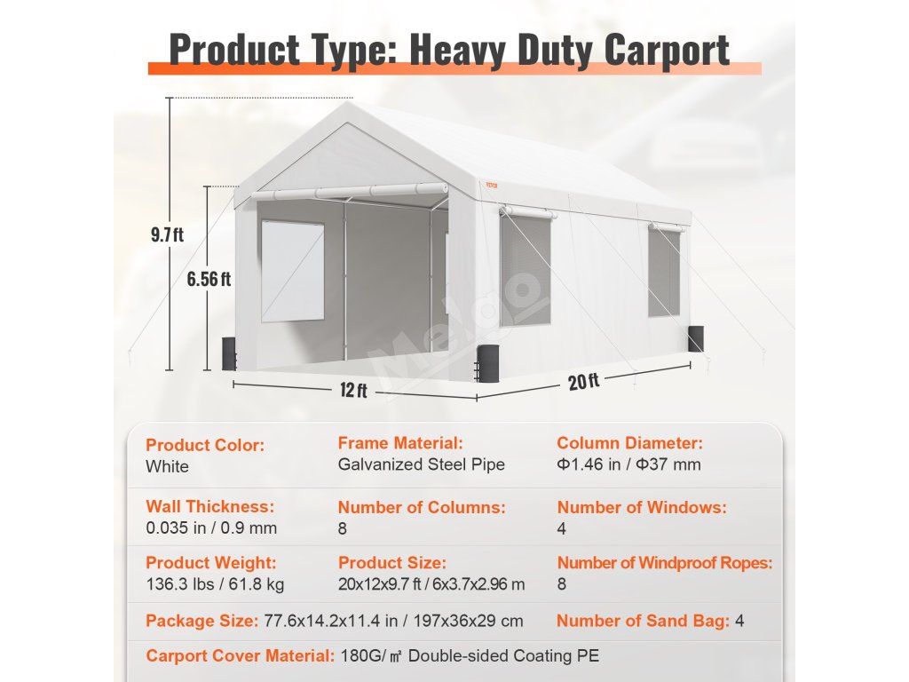 Vaša investícia do prístrešku na auto s rozmermi 12 x 20 stôp s vysokou odolnosťou je pre váš pokoj. Nie je to len ochranný kryt na SUV, auto alebo loď, ale viacúčelový doplnok vášho domova. Tak prečo čakať? Vylepšite svoj vonkajší priestor s prístreškom na auto VEVOR ešte dnes.
