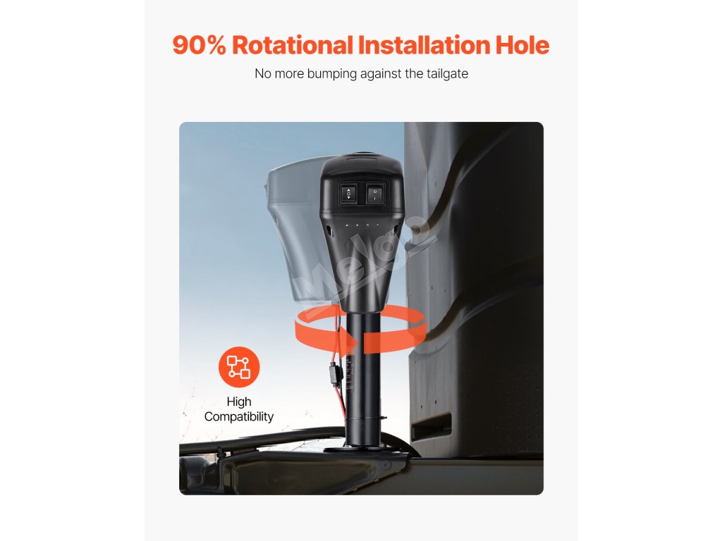 Vďaka zdokonalenému otočnému montážnemu otvoru elektrický zdvihák prívesu nezasahuje do zadných dverí. Vhodný pre prívesy pre obytné vozidlá, prívesy pre kone, úžitkové prívesy a ďalšie.