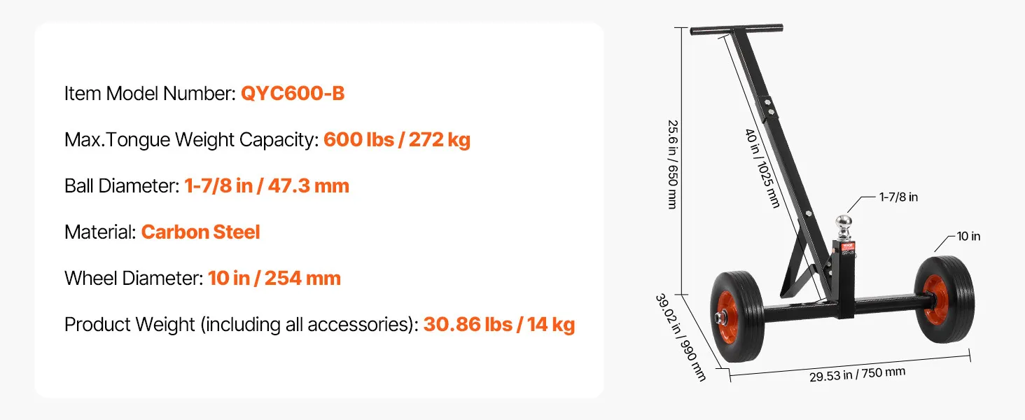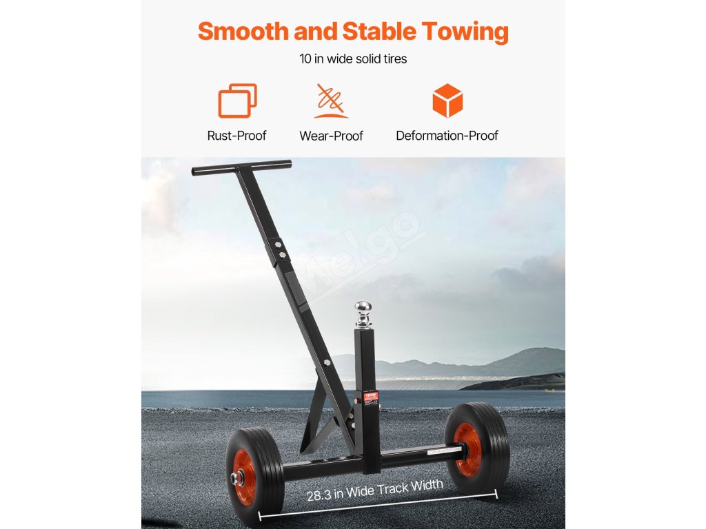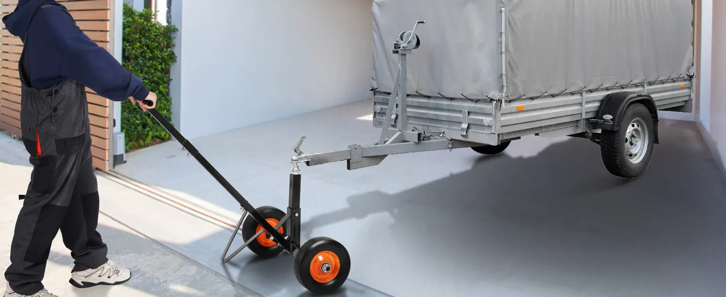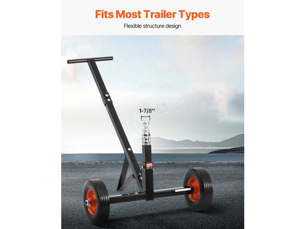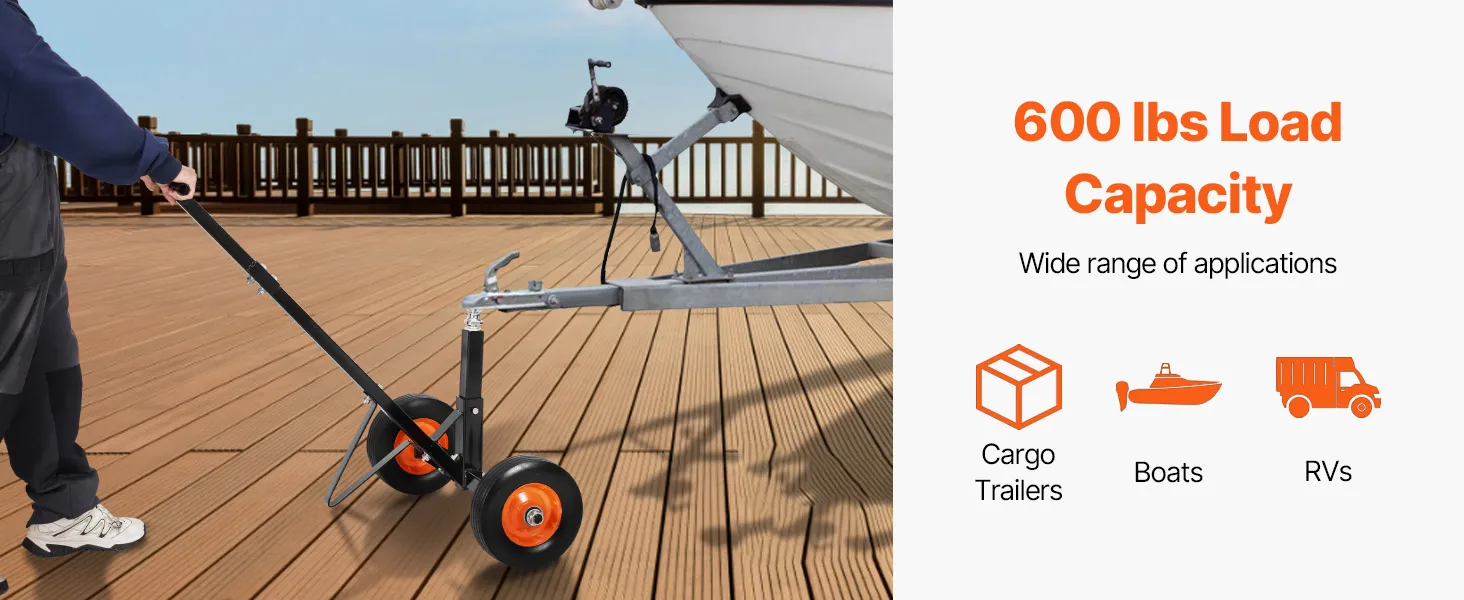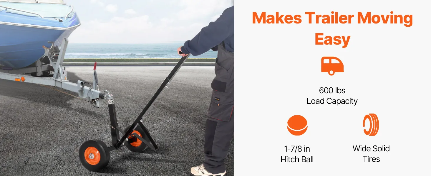 Tento vozík na prívesy má nosnosť jazyka 600 libier, vďaka čomu dokáže ľahko premiestniť ťažké prívesy na krátku vzdialenosť.